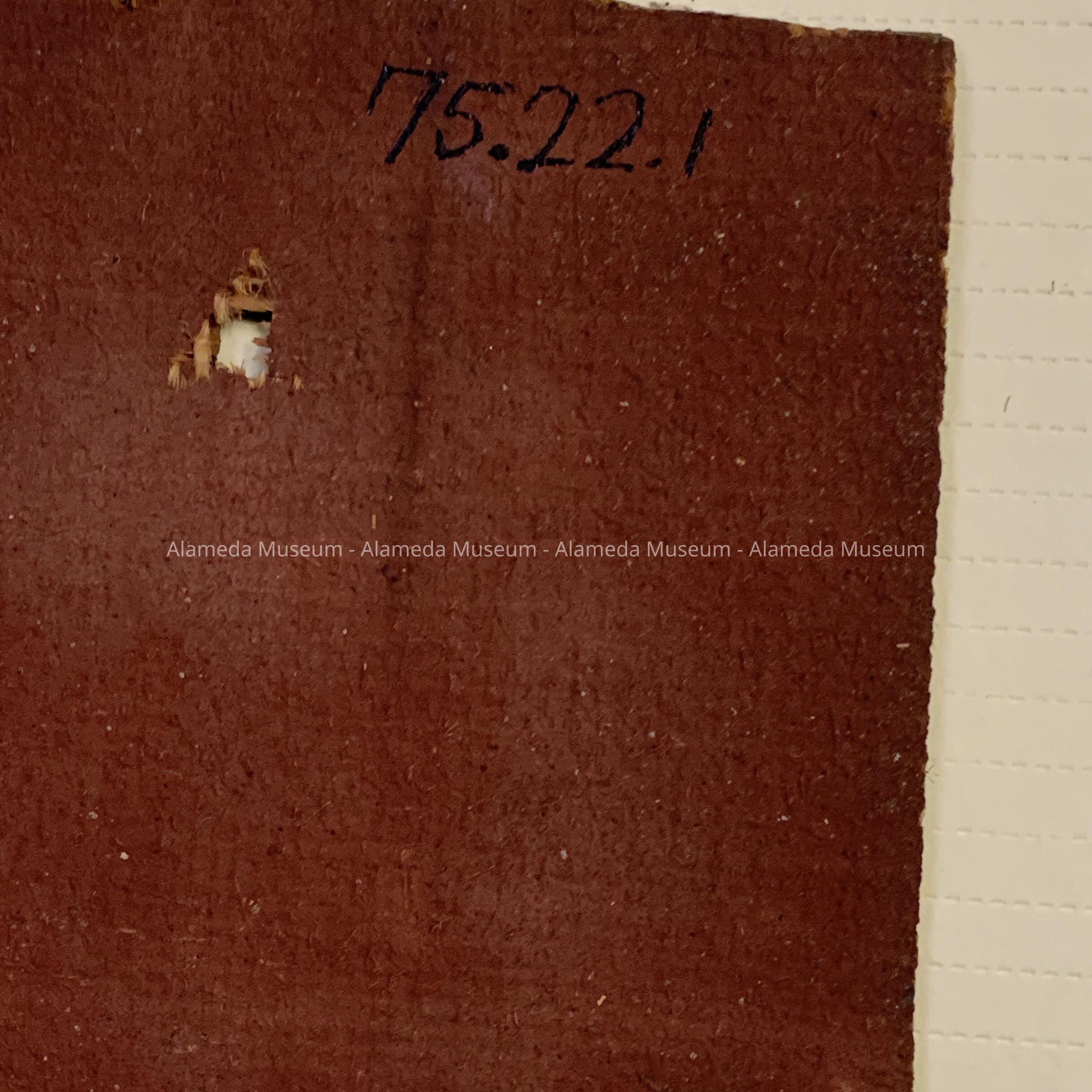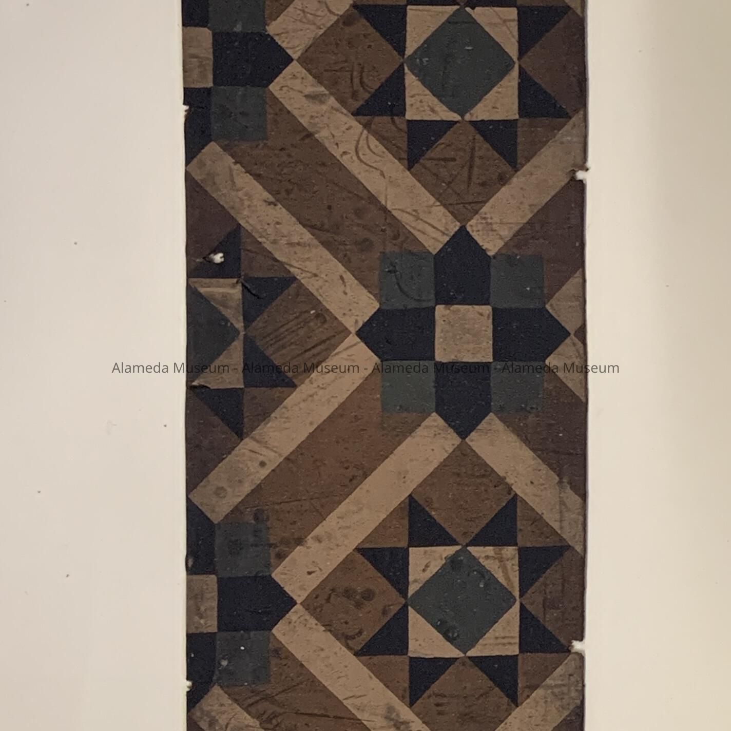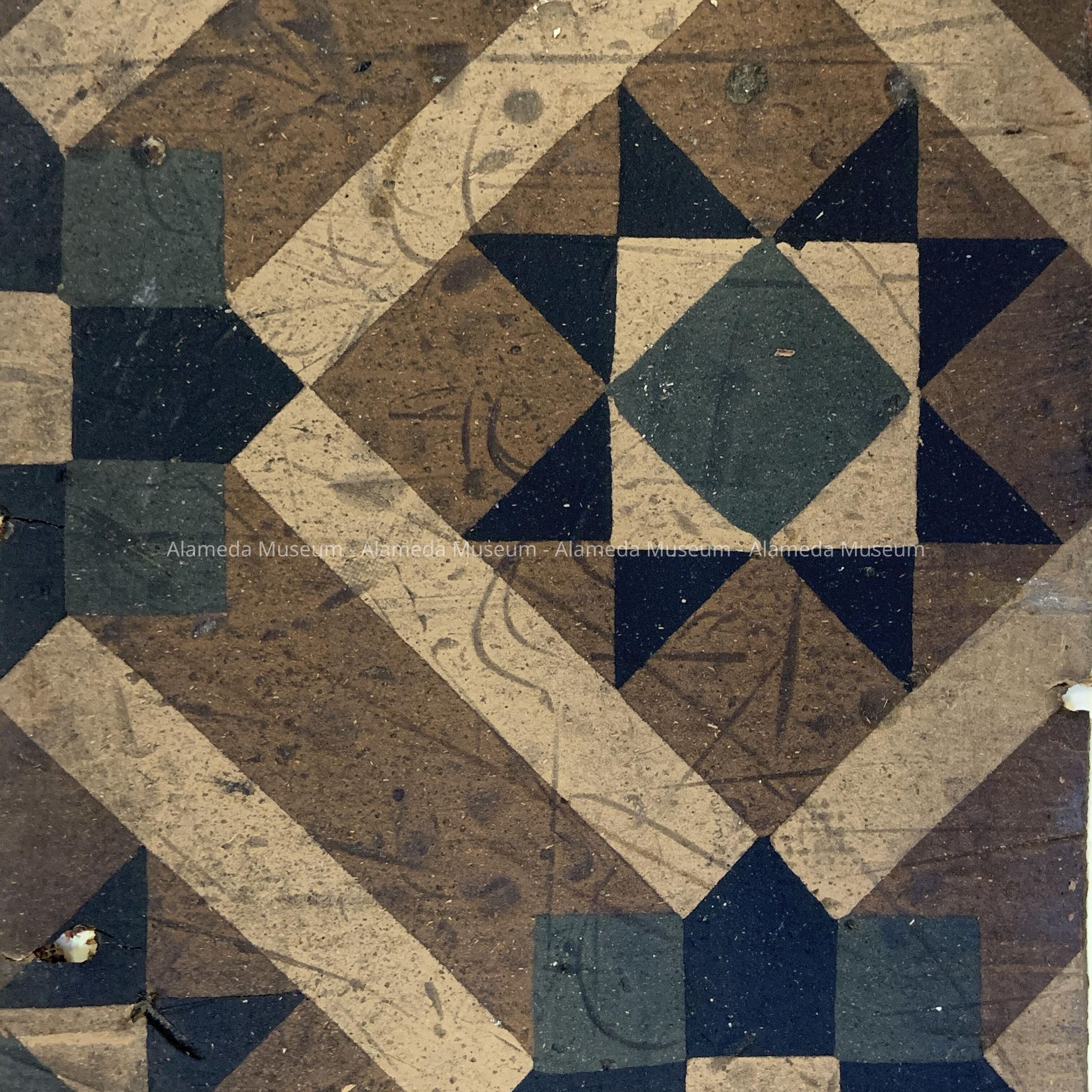 HISTORY OF OBJECT: LINOLEUM SAMPLE TAKEN FROM 2904 LINCOLN AVENUE, ALAMEDA. A VICTORIAN STICK STYLE RESIDENCE. THE HOME IS LOCATED IN THE JOHNSON TRACT. SUBDIVIDED IN 1889. THE FLOOR COVERING IS CIRCA 1900? INSTEAD OF THE PATTERN BEING PRINTED ON THE SURFACE OF THE LINOLEUM, IT IS COMPOSED FROM MATERIAL USED ON THE ORDER OF A MOSAIC, WITH THE SEPARATE DESIGNS FUSED TOGETHER. THE LINOLEUM IS BURLAP BACKED.