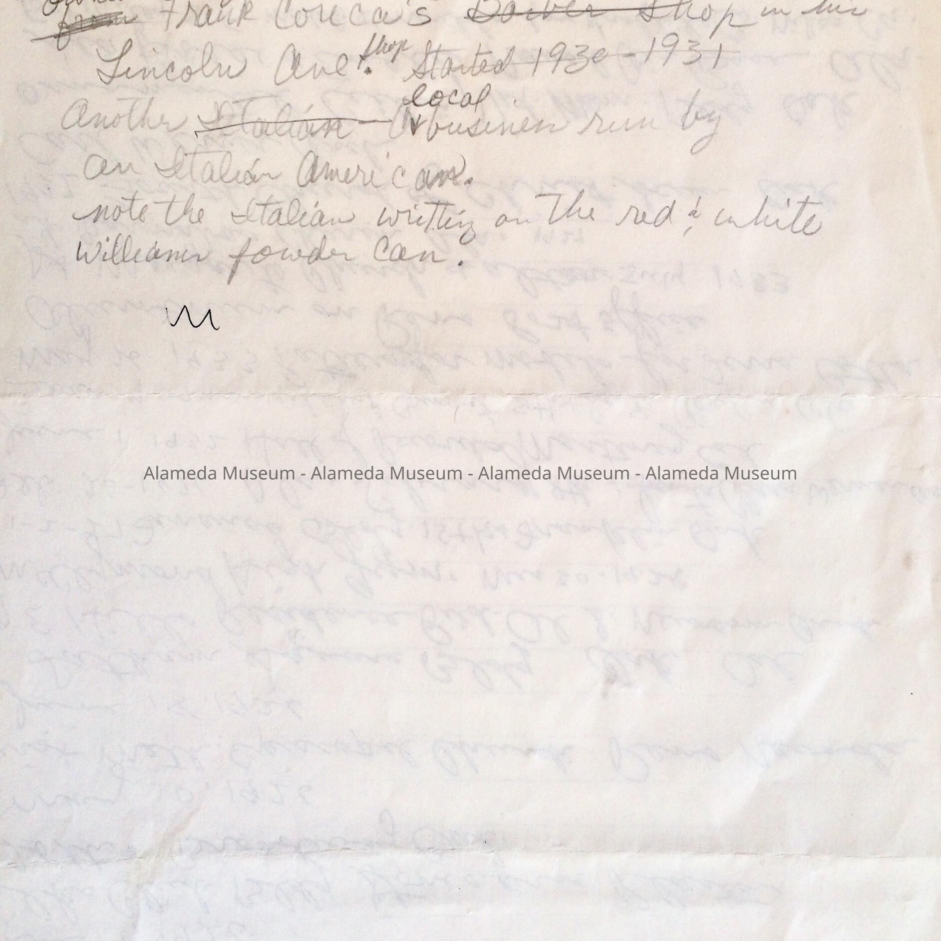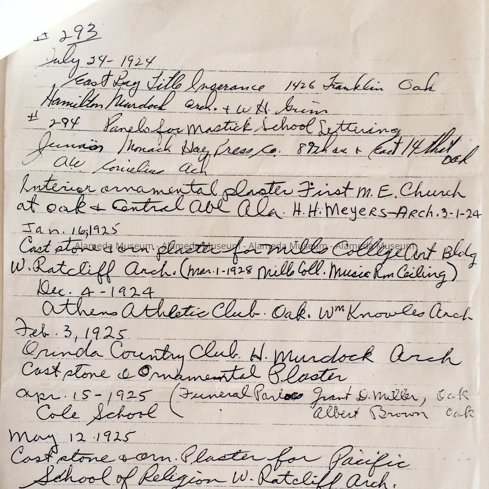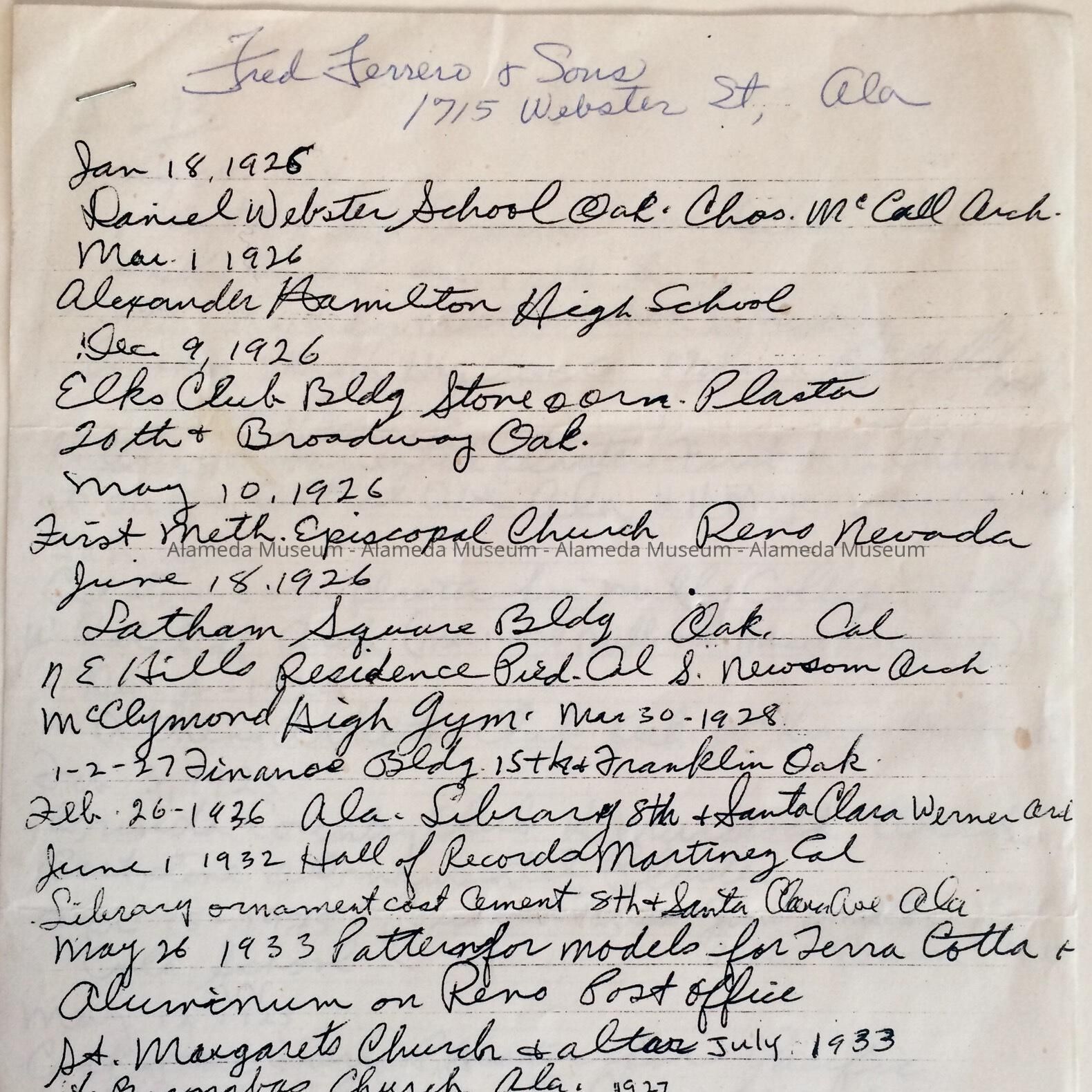 HISTORY OF OBJECT: LIST, POSSIBLY COMPILED BY THE LATE AL FERRERO. DECORATIVE CEMENT WORK WAS CREATED BY HIS FATHER'S BUSINESS --- FRED FERRERO & SONS, 1715 WEBSTER STREET, ALAMEDA, CALIFORNIA. MR FERRERO & SONS WERE FABRICATORS OF DECORATIVE ORNAMENTAL WORK FOR THE FACADES OF MANY BUILDINGS. THEY ALSO PERFORMED CAST STONE AND ORNAMENTAL PLASTER WORK. THE LIST DISPLAYS NAMES OF BUSINESSES FOR WHOM THEY PERFORMED WORK FROM 1920 TO 1933. THEY ALSO CREATED THE SEA HORSE AND EAGLE AT THE ALAMEDA NAVAL AIR STATION.