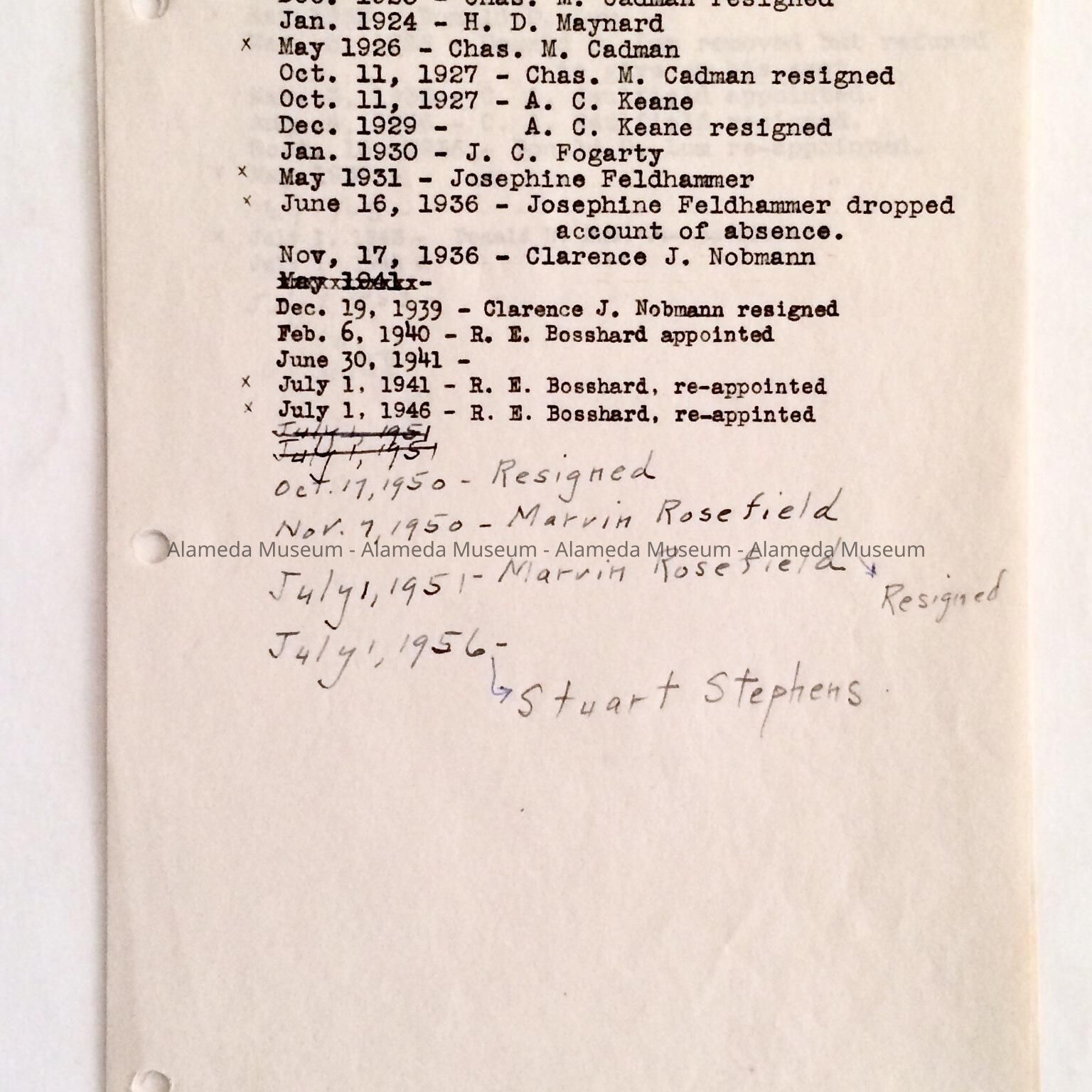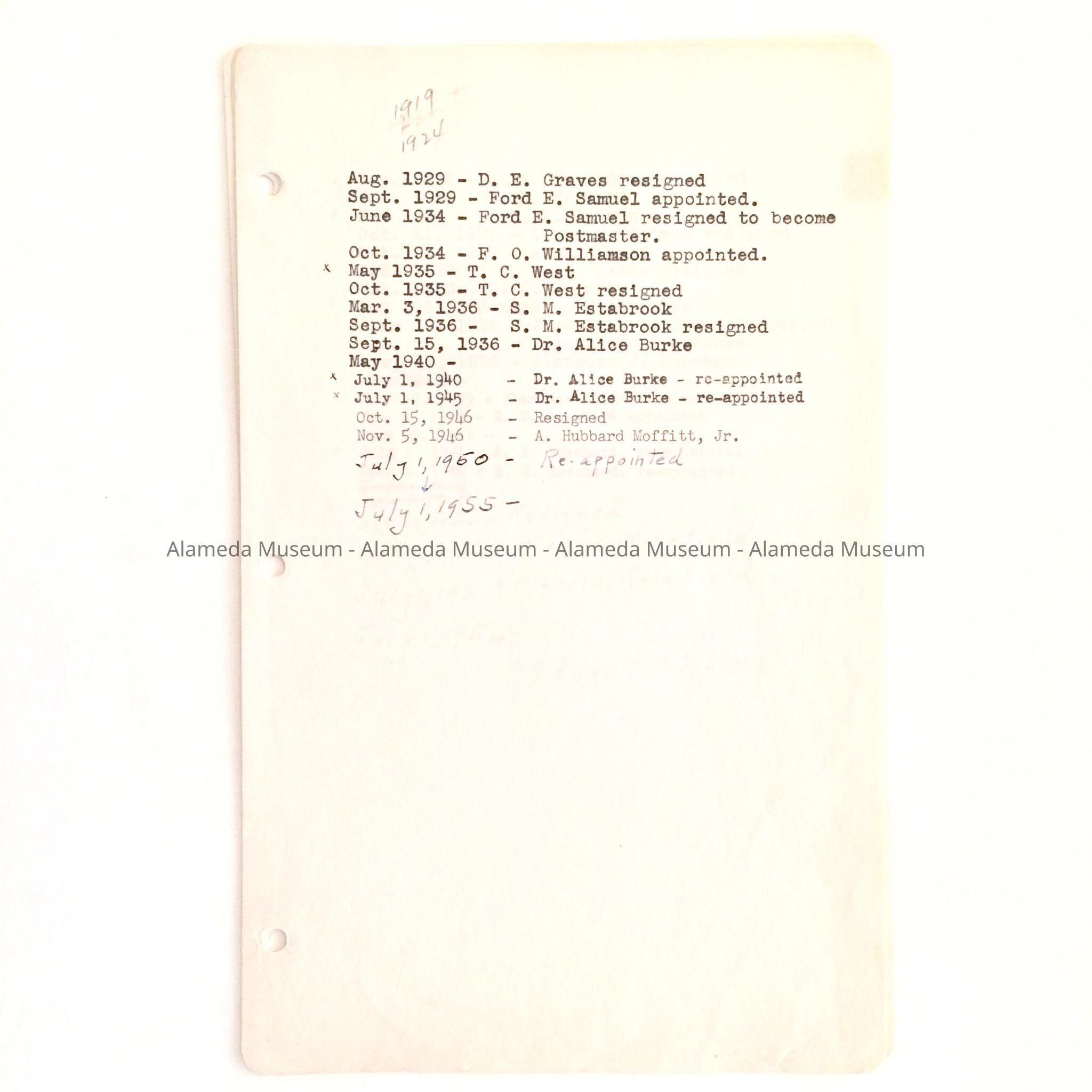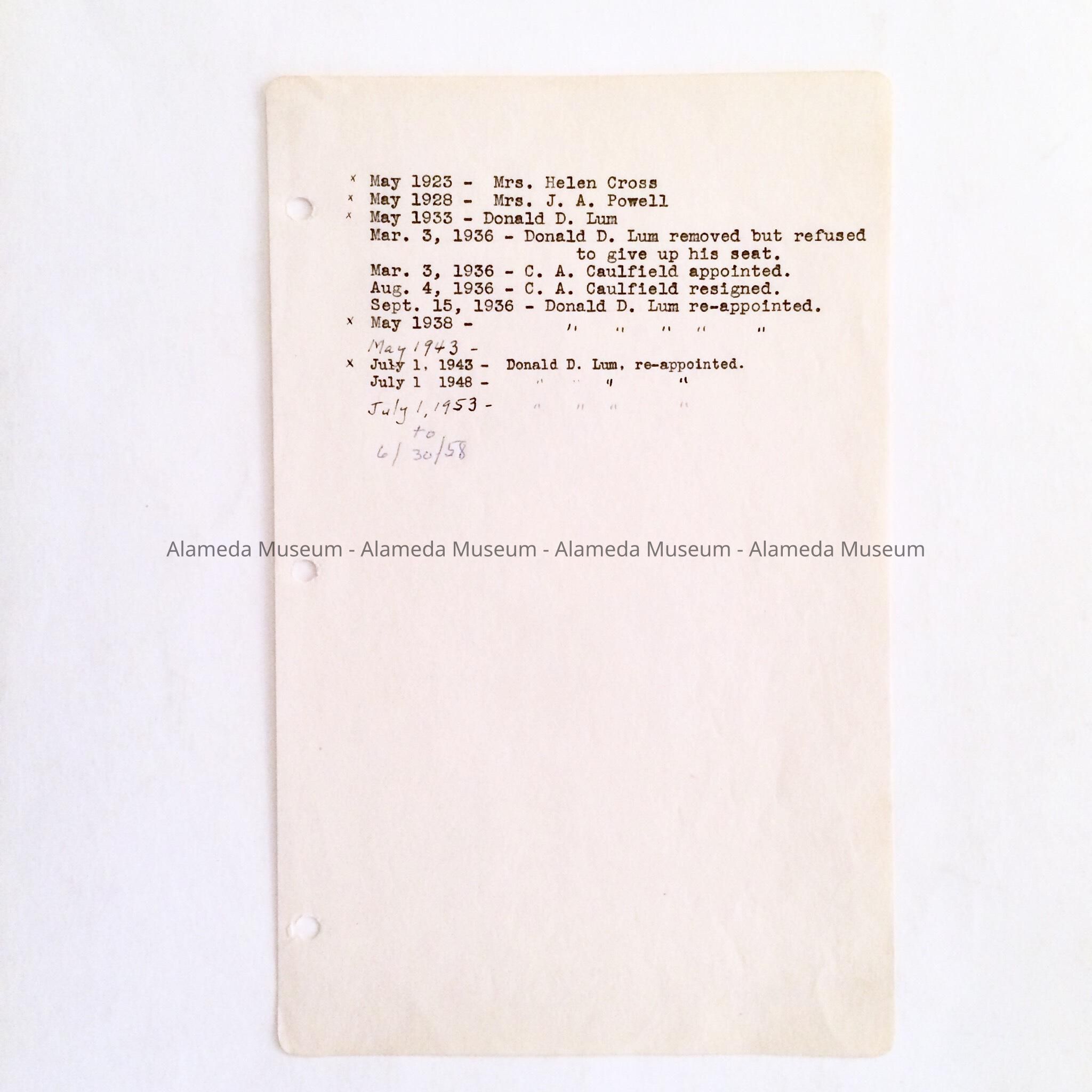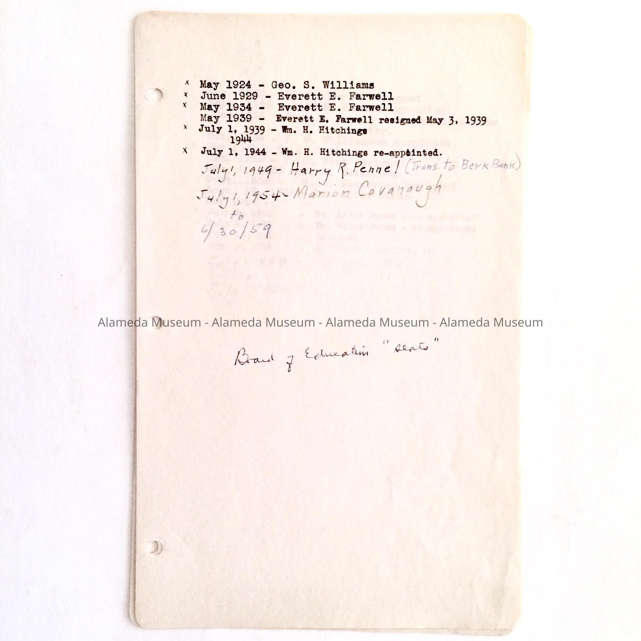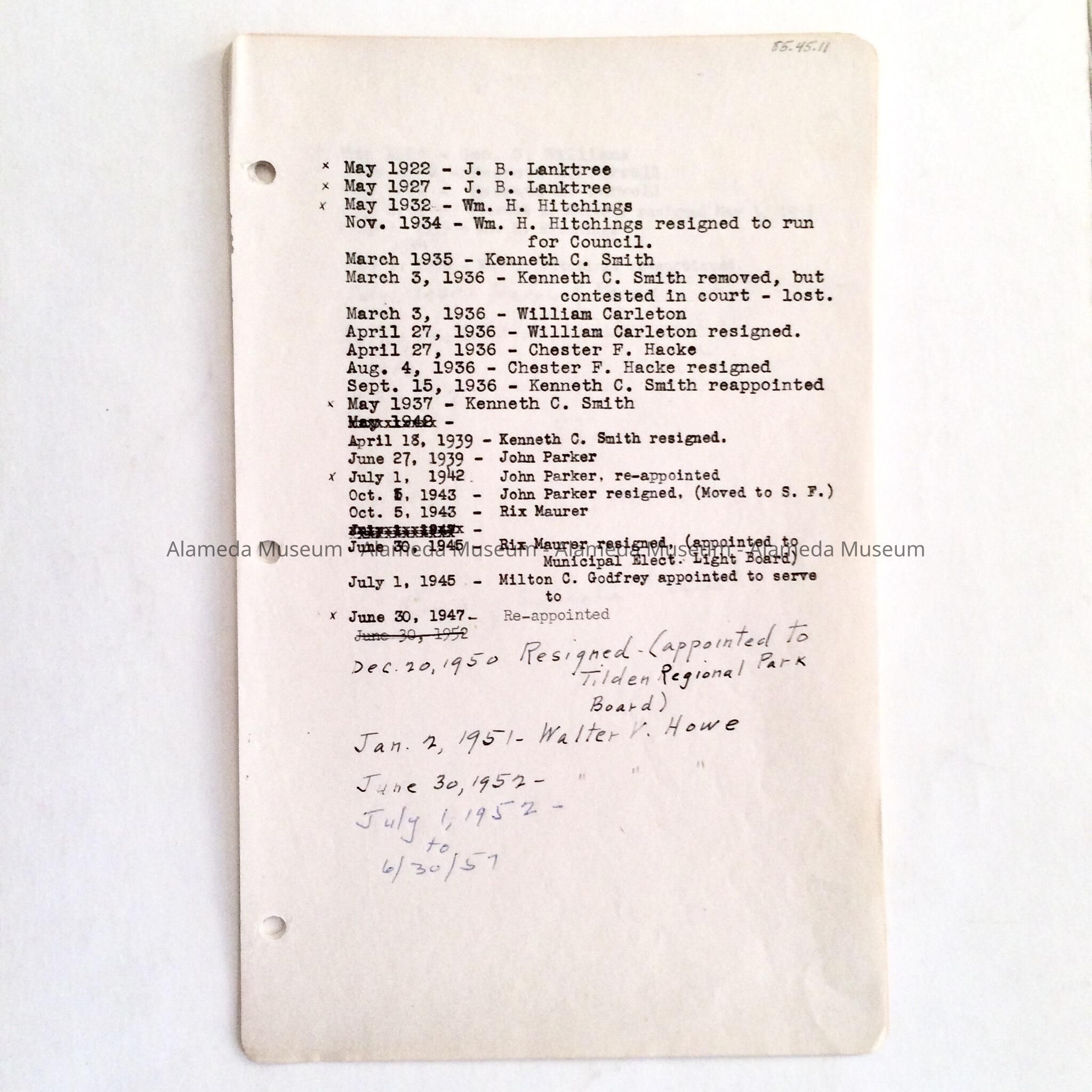A typewritten compiled list of Board of Education members, date of appointment, date of resignation, etc., beginning in 1922, to 1957.