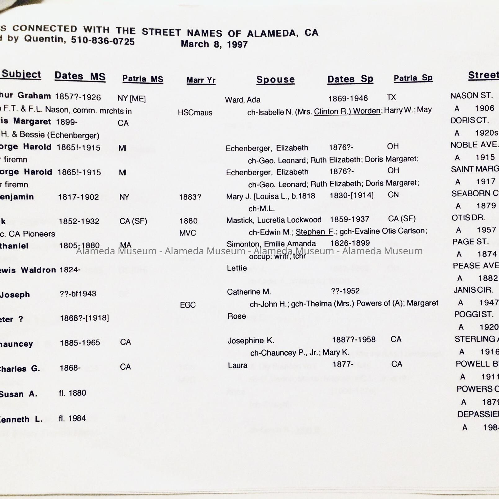 AN ALPHABETICAL LIST OF PERSONS CONNECTED WITH THE STREET NAMES IN ALAMEDA. COMPILED BY QUENTIN, AND DATED MARCH 8, 1997.