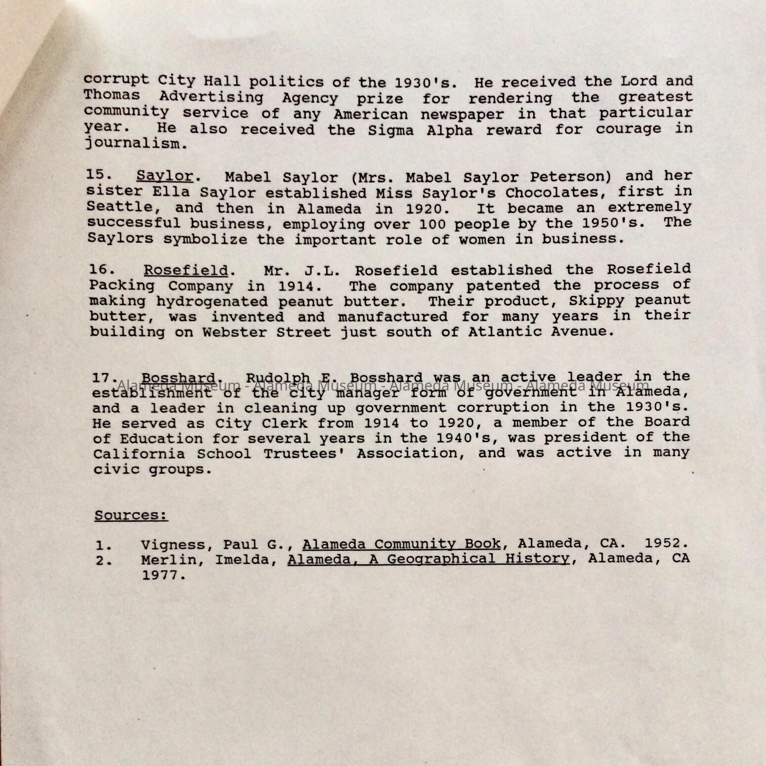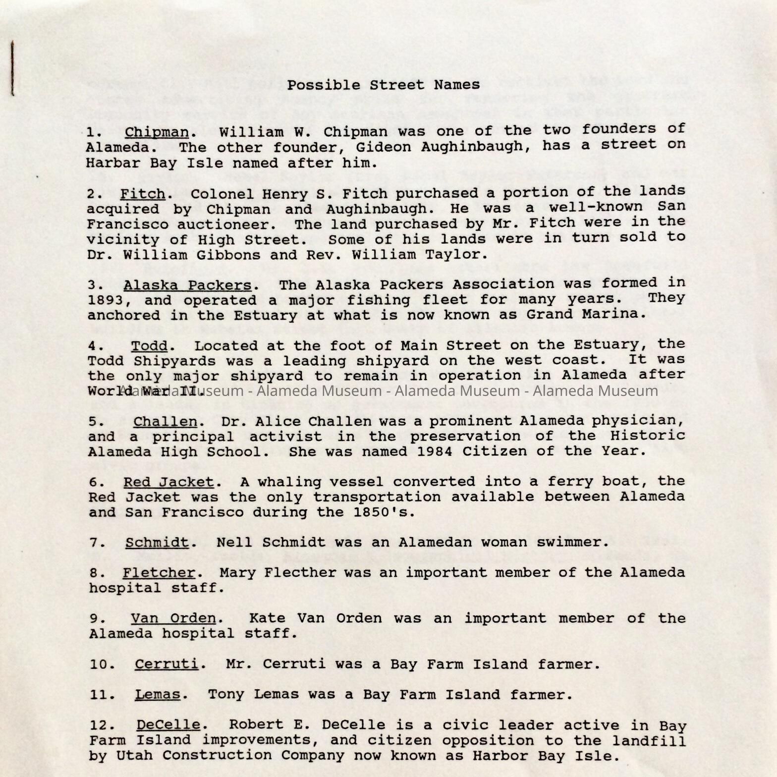 History of Object: List of names of businesses, individuals, and one vessel, that could be used as street names. Each name has a brief history.
