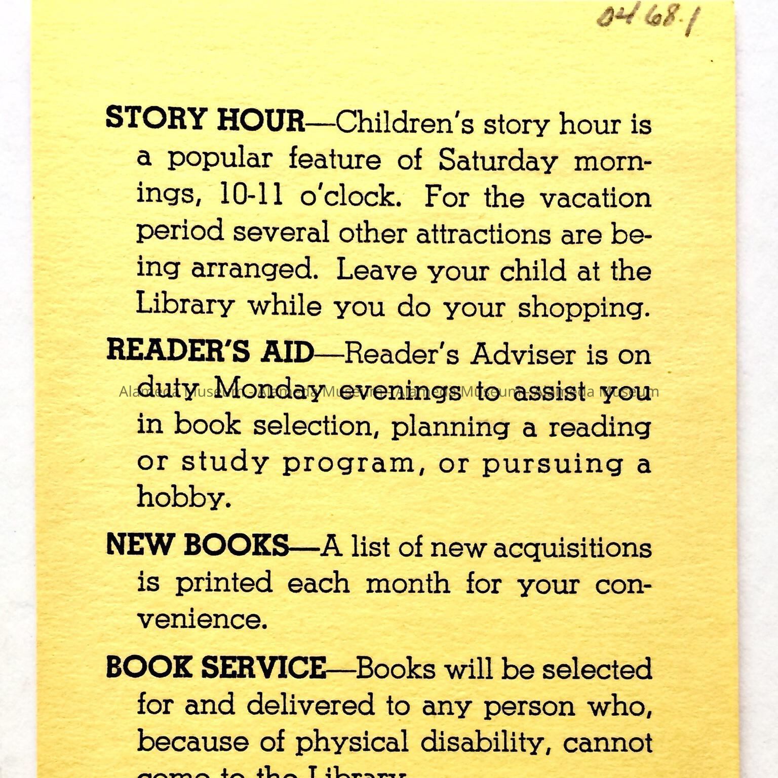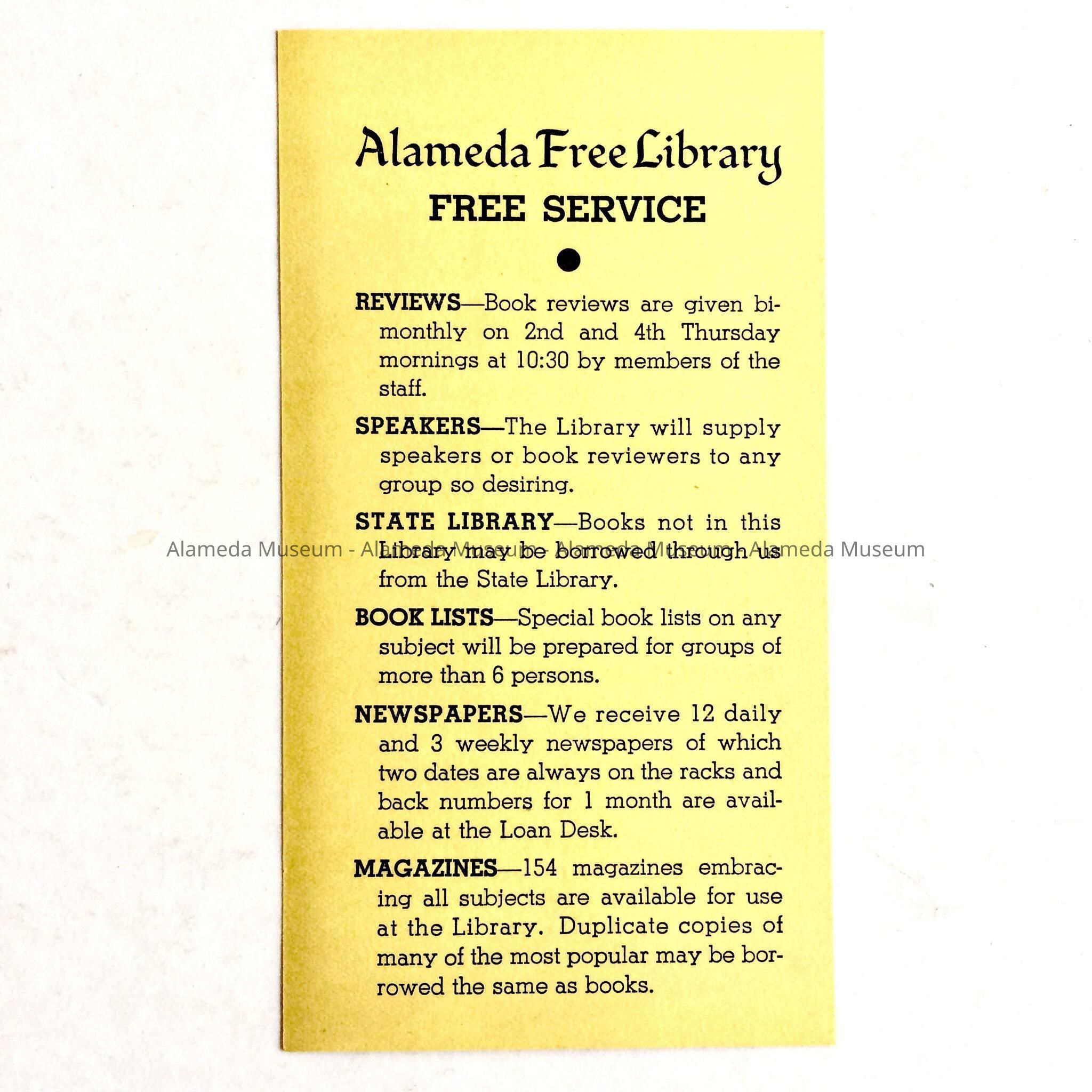 List of Services offered by the Alameda Free Library, prior to 1970Entry/Object ID