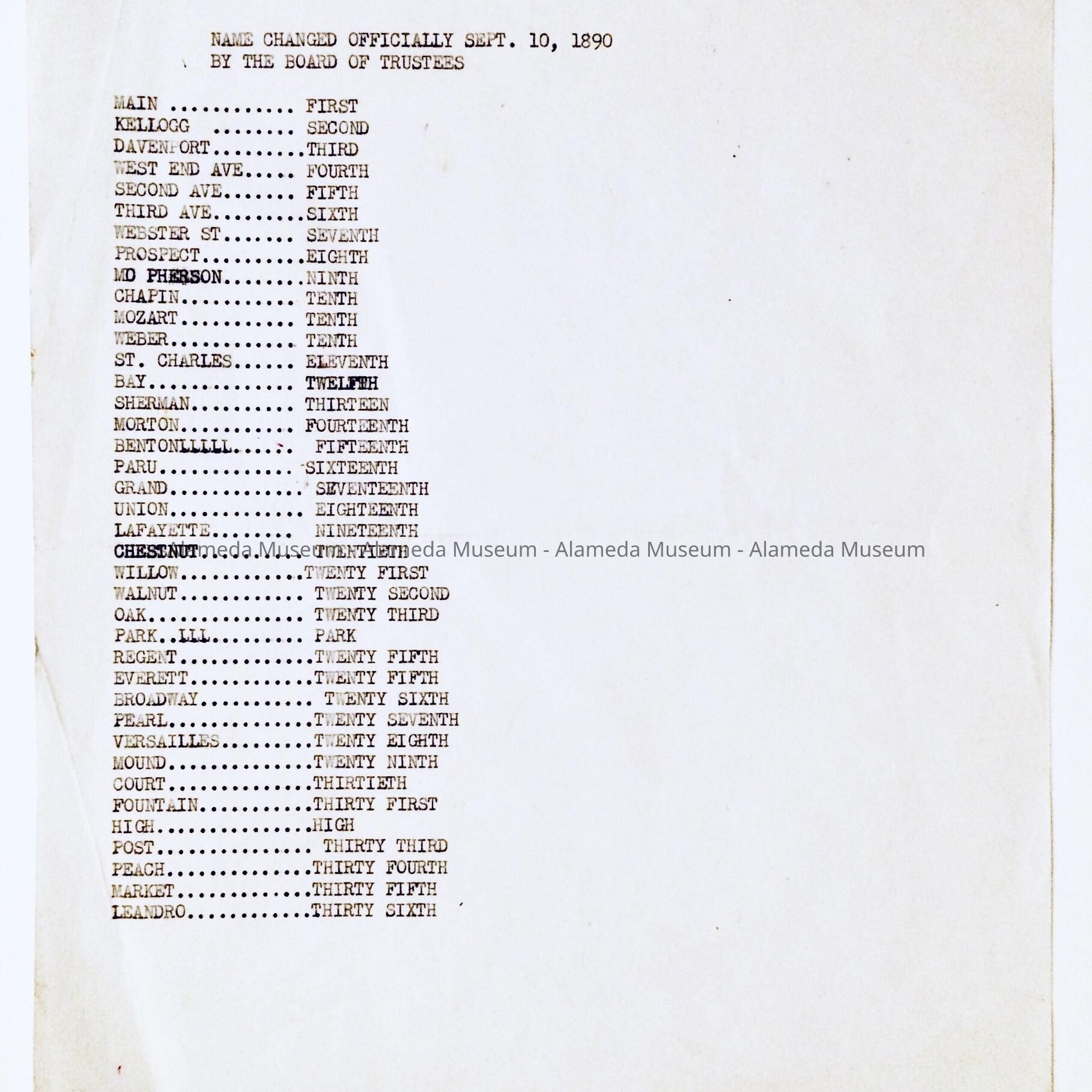 A listing enacted in 1890 when it was decided to change the street names of the city of Alameda to numbers beginning with First Street to 36th Street and houses numbered accordingly. The change was officially adopted by the Board of Trustees but failed due to unpopularity with the residents of the city of Alameda. The streets reverted back to the originally-named streets.