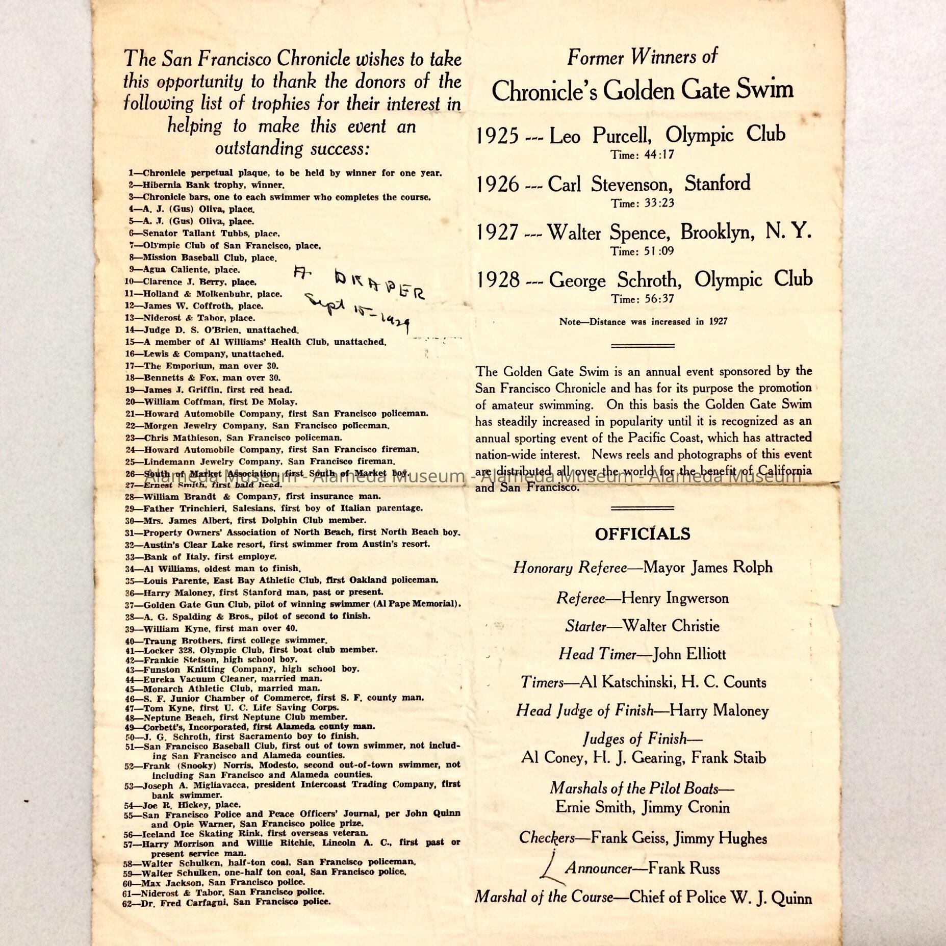 List of swimmers and sponsors for Golden Gate Swim, 1929Entry/Object ID