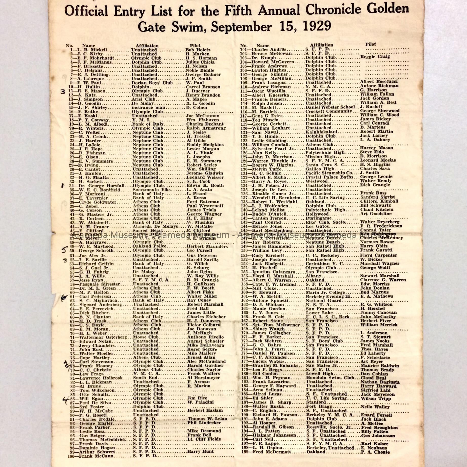 AN ENTRY LIST, WITH BOLD-PRINTED CAPTION, "OFFICIAL ENTRY LIST FOR THE FIFTH ANNUAL CHRONICLE GOLDEN GATE SWIM," DATED SEPTEMBER 15, 1929.