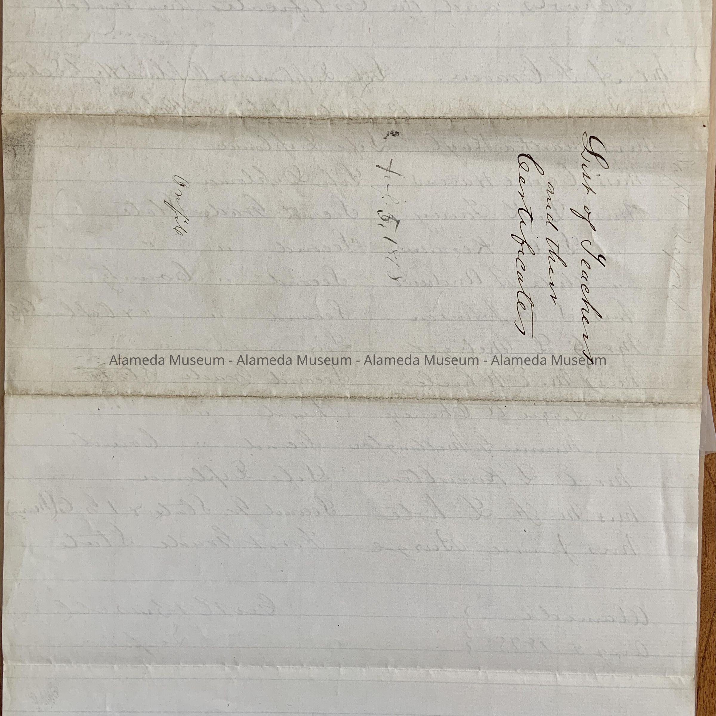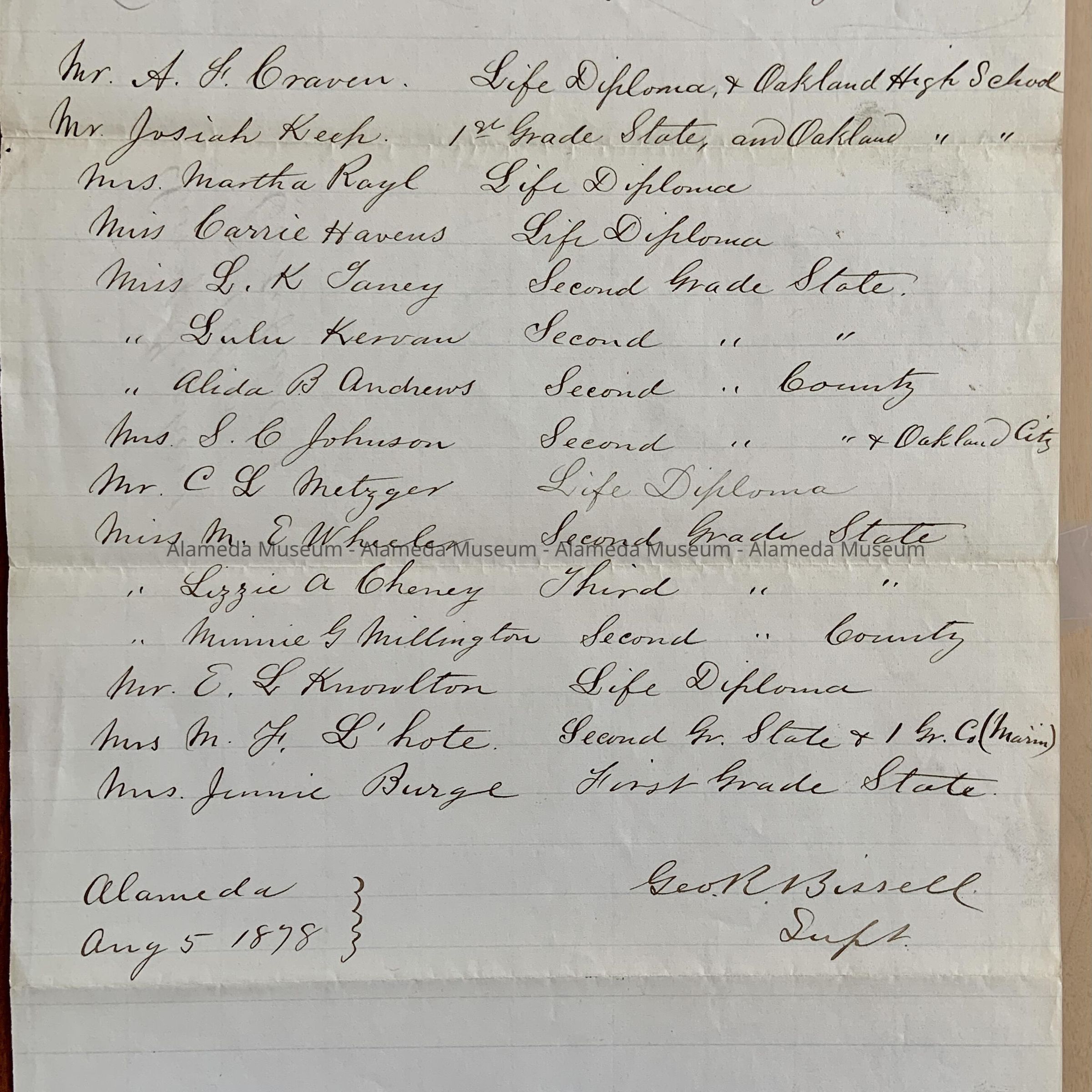 HISTORY OF OBJECT: A LISTING OF TEACHERS IN THE ALAMEDA SCHOOLS AS WELL AS THE CERTIFICATES THEY HELD, DATED AUGUST 5, 1878. LIST WAS SUBMITTED BY GEORGE BISSELL, SUPERINTENDENT.