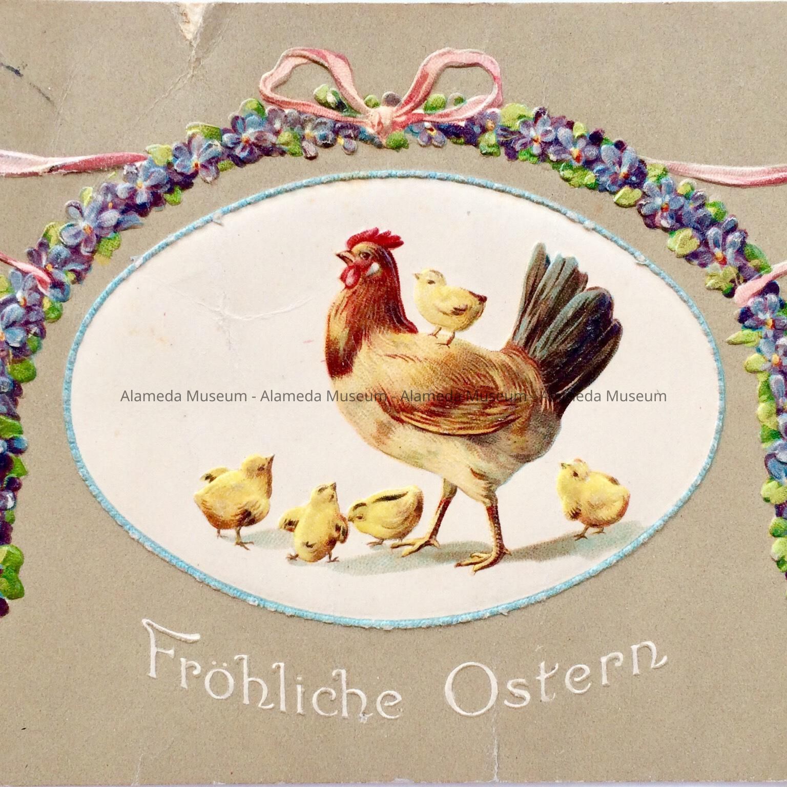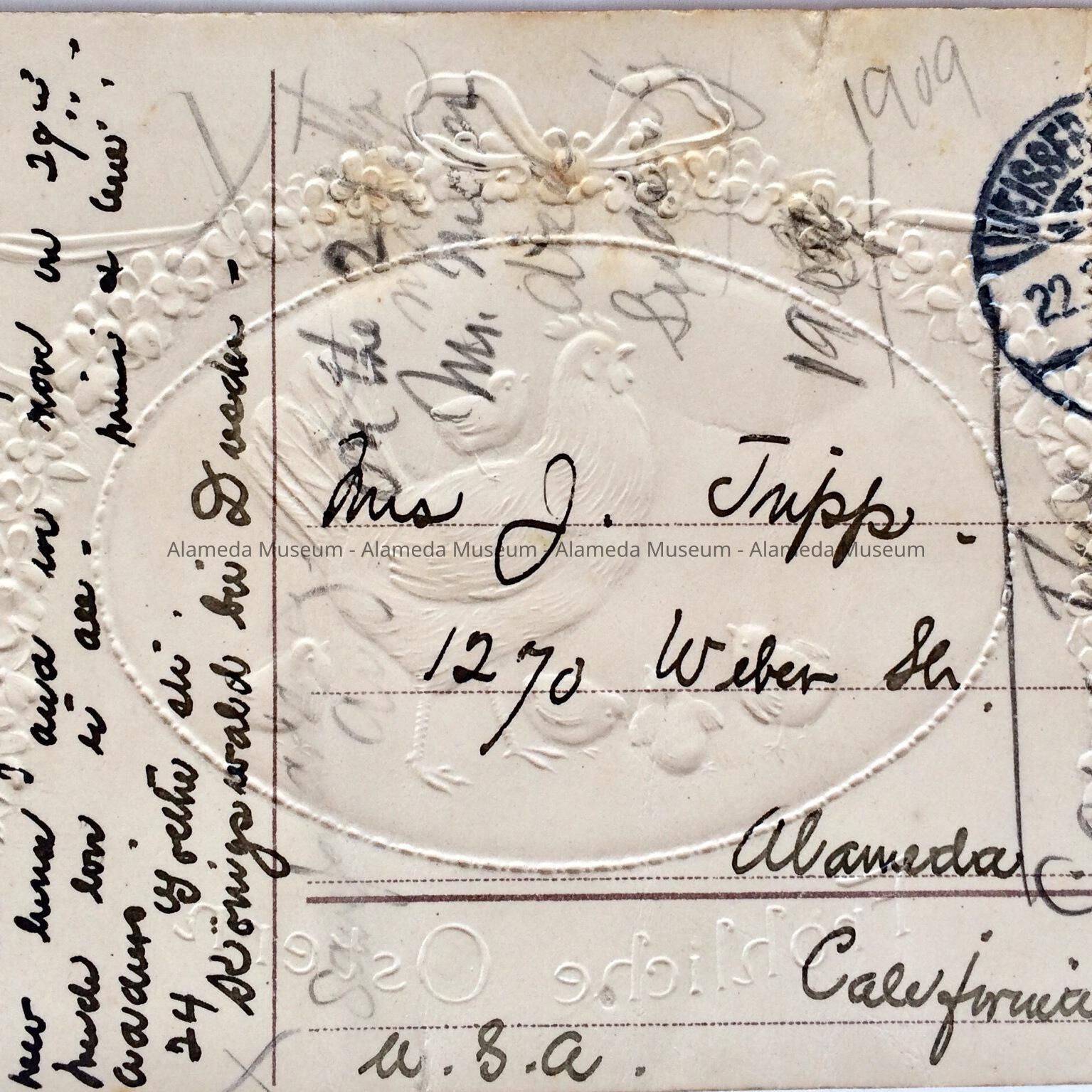 German Easter postcard sent to Mrs. Elizabeth Tripp, daughter of Wm. W. Chipman (co-founder City of Alameda), 1270 Weber Street, Alameda.
