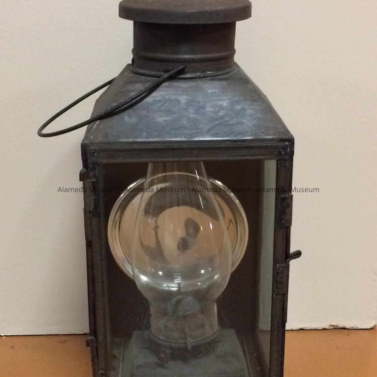 [A galvanized steel hand lamp from the home of early Alameda residents.]