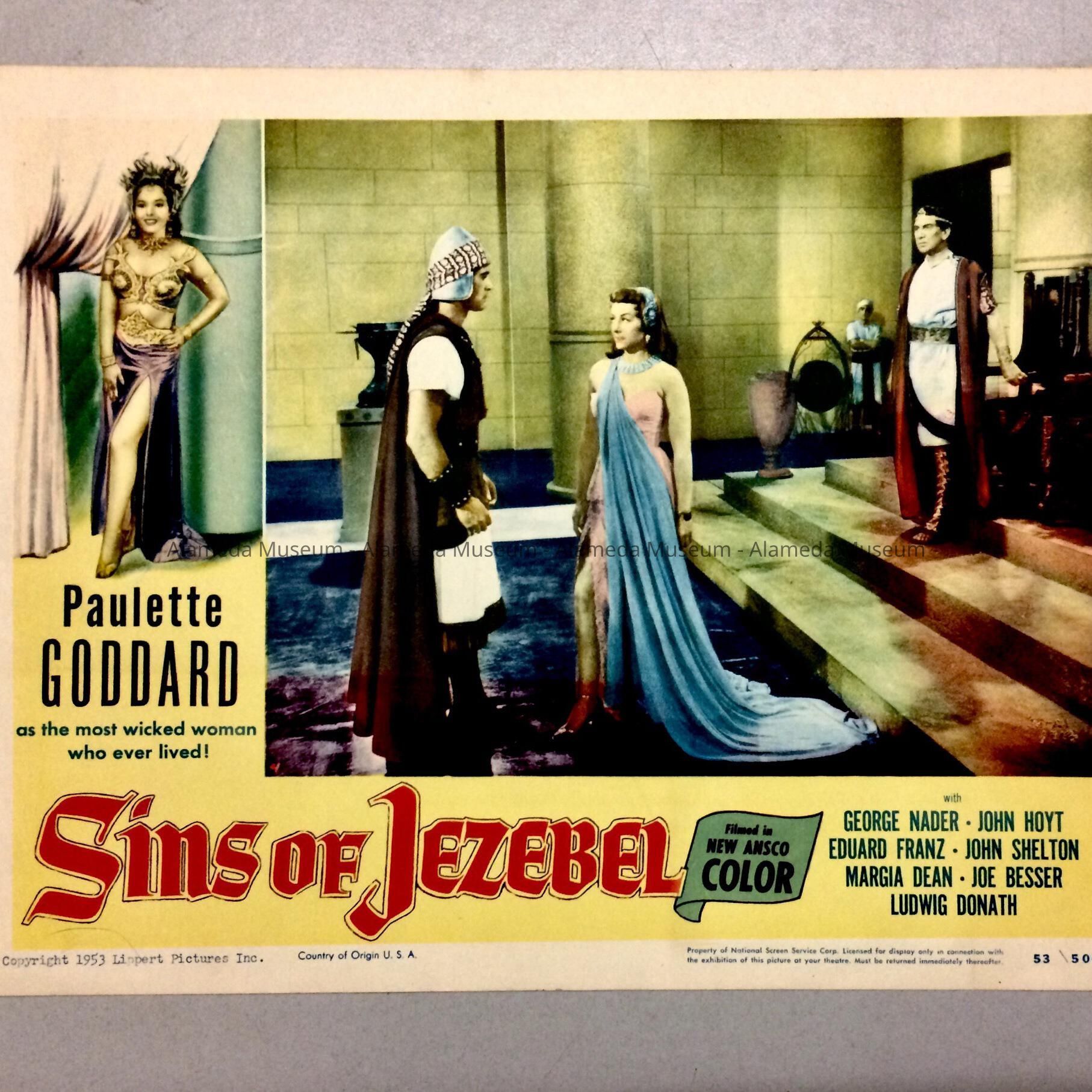 Illustrated lobby card for the motion picture “Sins of Jezebel” starring Paulette Goddard and produced by Lippert Pictures, Inc, copyrighted 1953. Mr. Lippert was a prominent motion picture producer and a long time resident of Alameda.