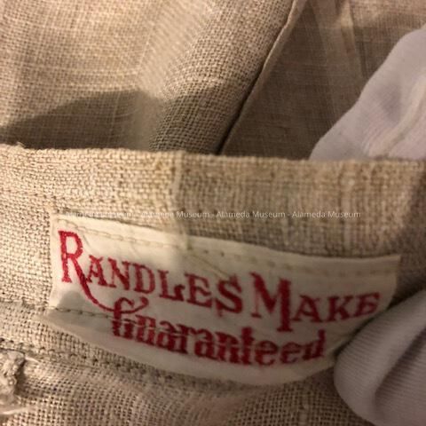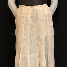 Description: Natural linen skirt has small sewn-down pleats and mother-of-pearl buttons running the length of both sides.