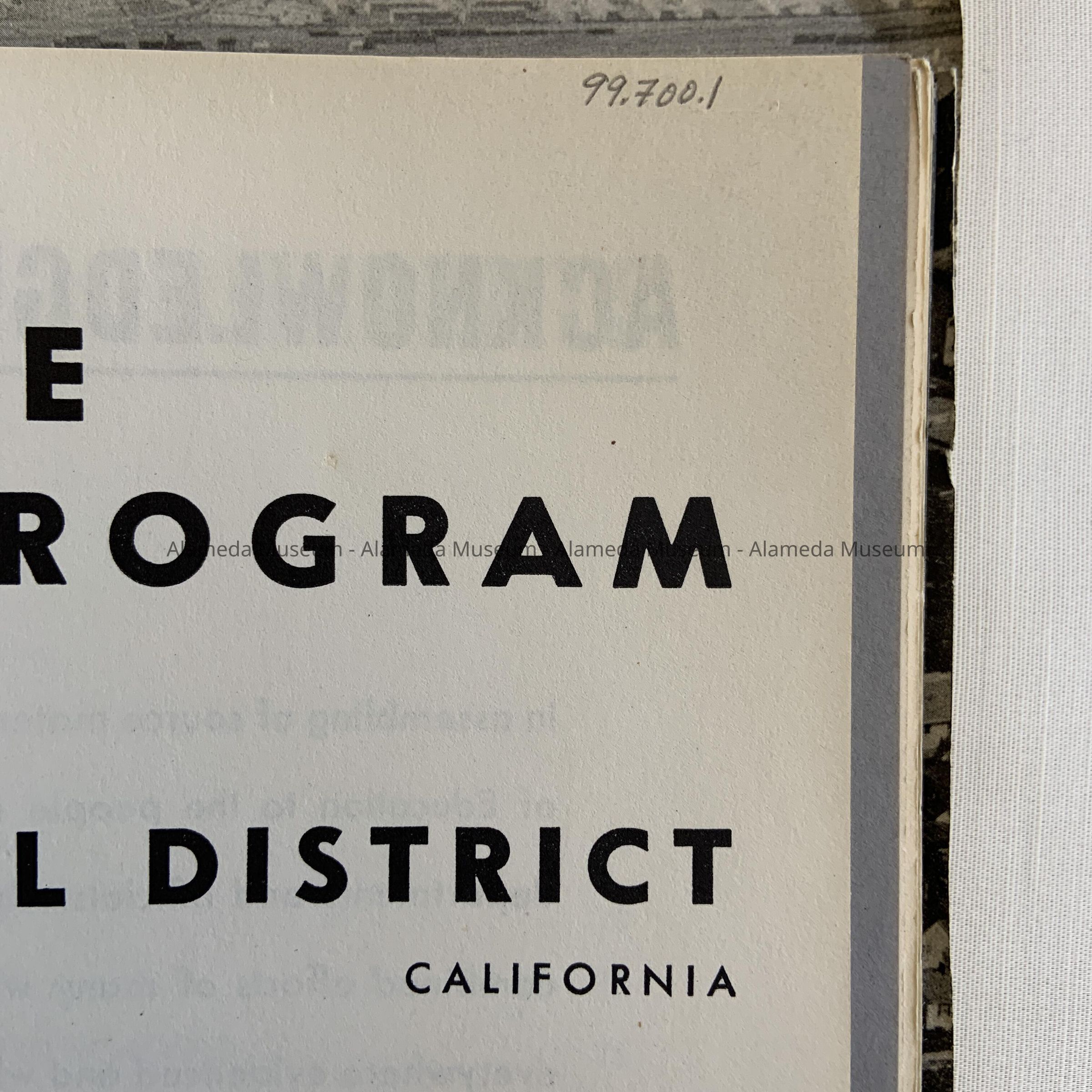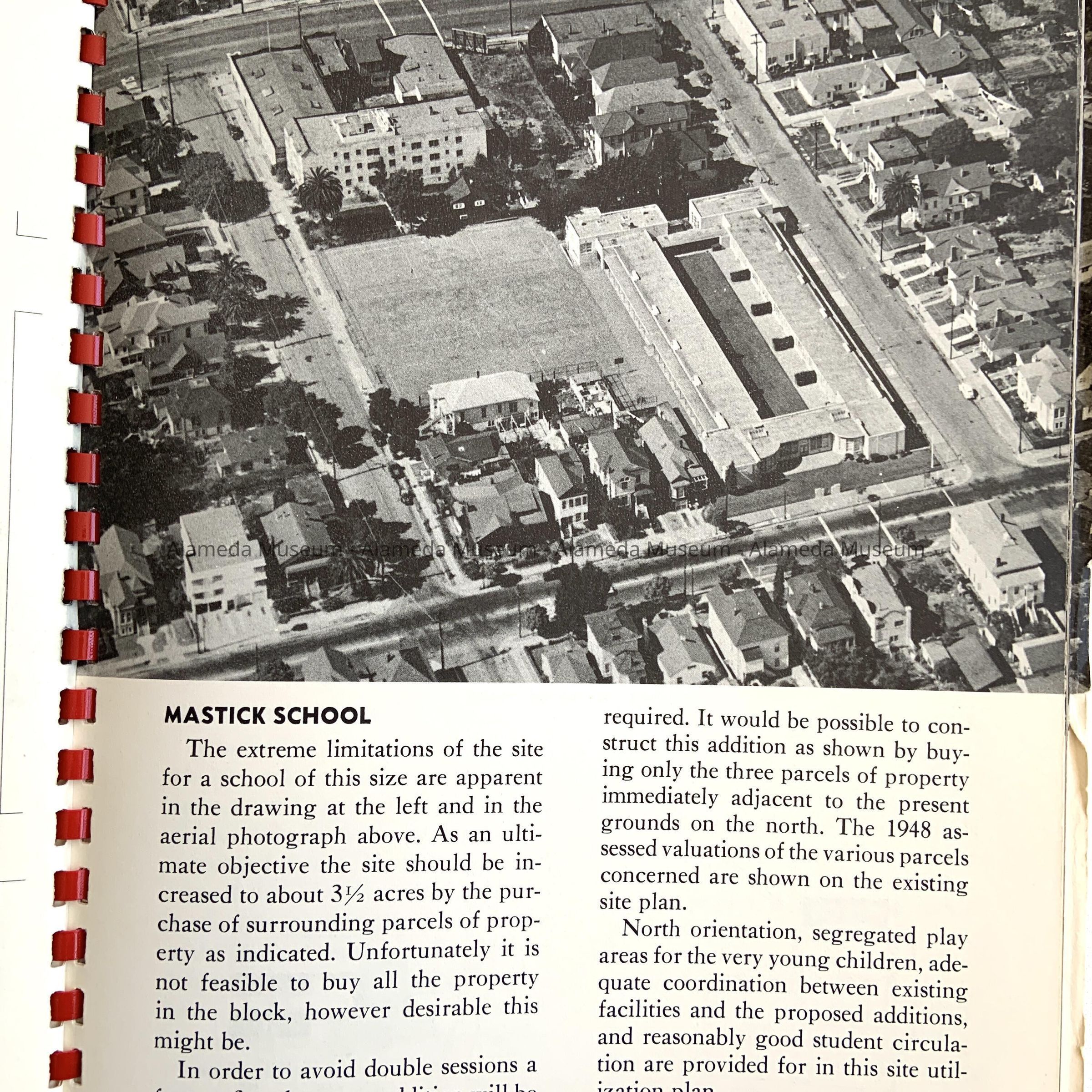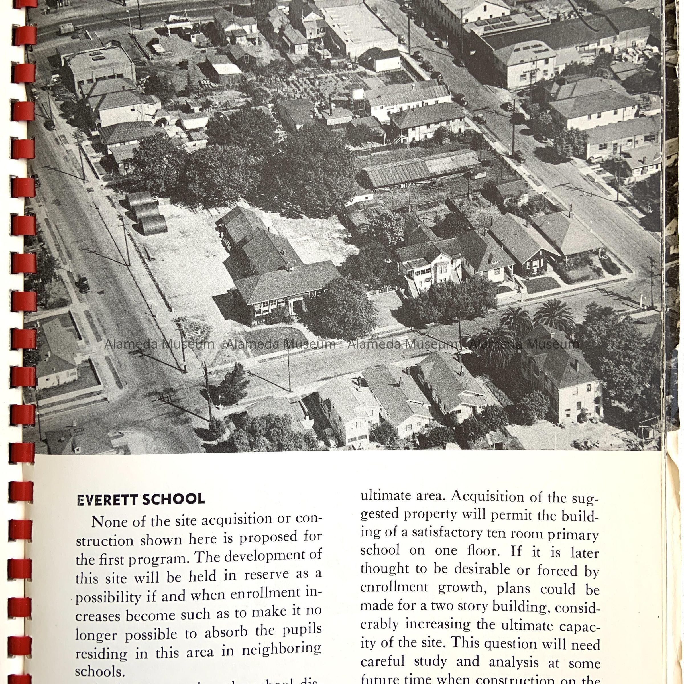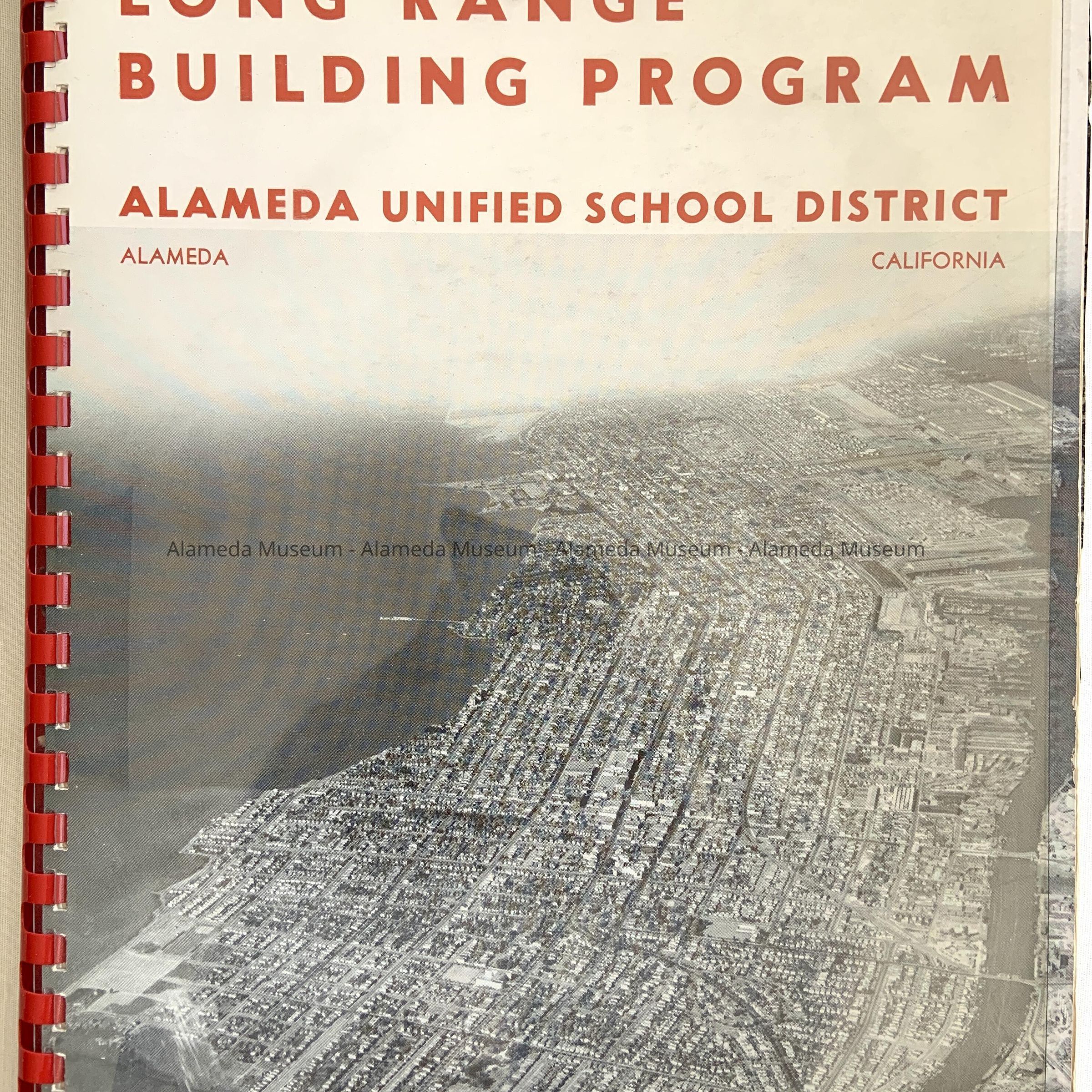 Description: 90 page report. Soft cover with red plastic spiral binding. Cover has aerial photograph of Alameda and bold printed caption "Long Range Building Program" in red and gray colored type on a white background.