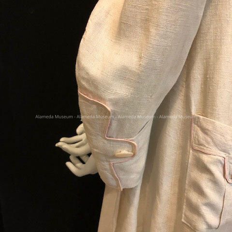 Long sleeves with bands and mother-of-pearl buttons at cuffs. Pink trim on pockets. Two pleats on back of duster. Unlined.