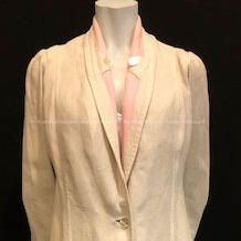 Description: Woman's auto duster of beige linen with shawl collar with pink trim.