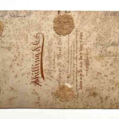 Description: Sepia-toned albumen print photo, mounted on tan paperboard. Photographer: Shilling & Co., S.F. (per imprinting on mounting and verso). Image has some spotting. The mounting has spotting, foxing, nail holes, and it has been cropped on its upper and lower margins.