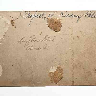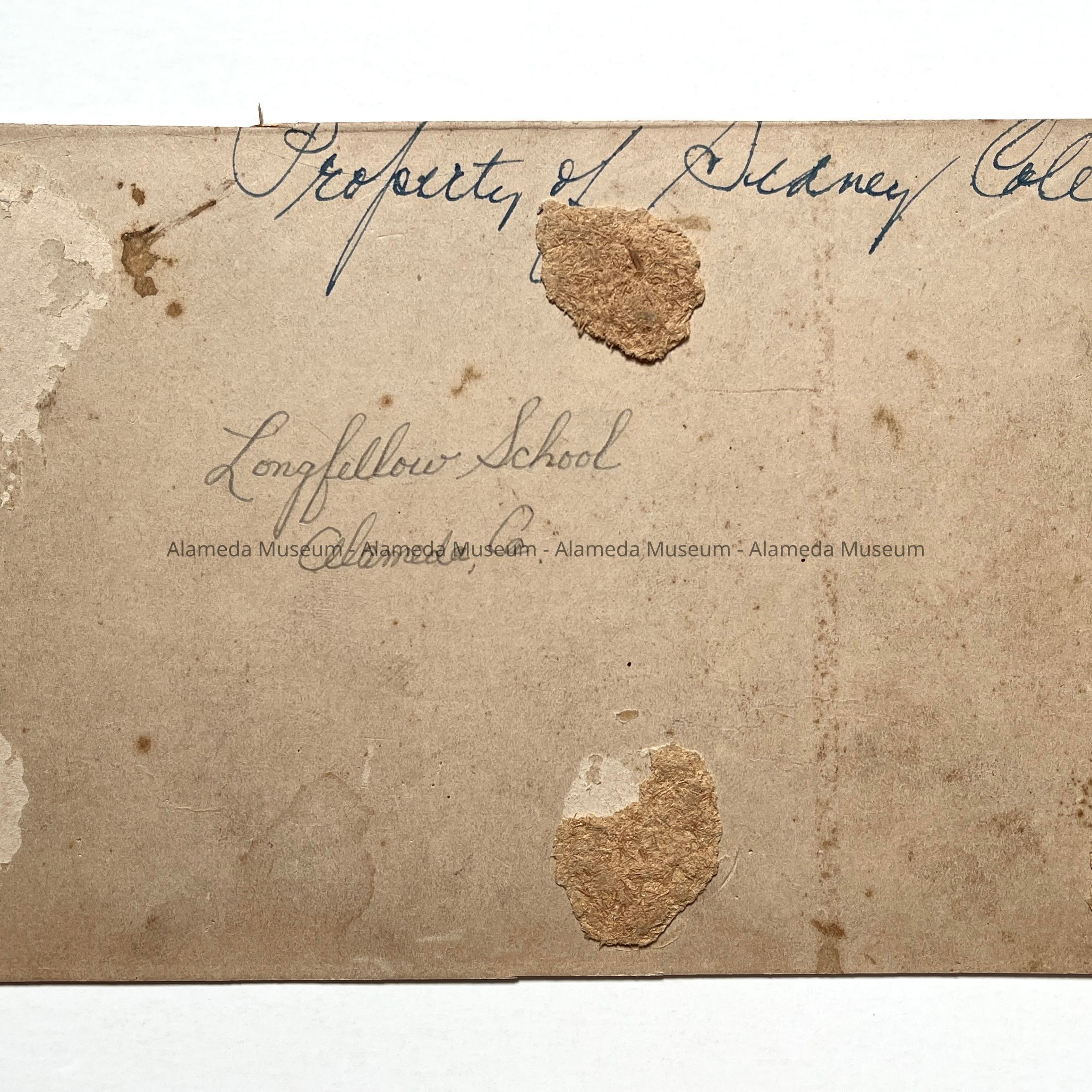 Description: Sepia-toned albumen print photo mounted on tan paperboard. Photo: Hugo Weitz, S.F. ( per name remnant on cropped mounting ). The image is badly faded and has some spotting. The mounting has nail holes, spotting blue ballpoint ink notations, and cropping on the upper and lower margins.