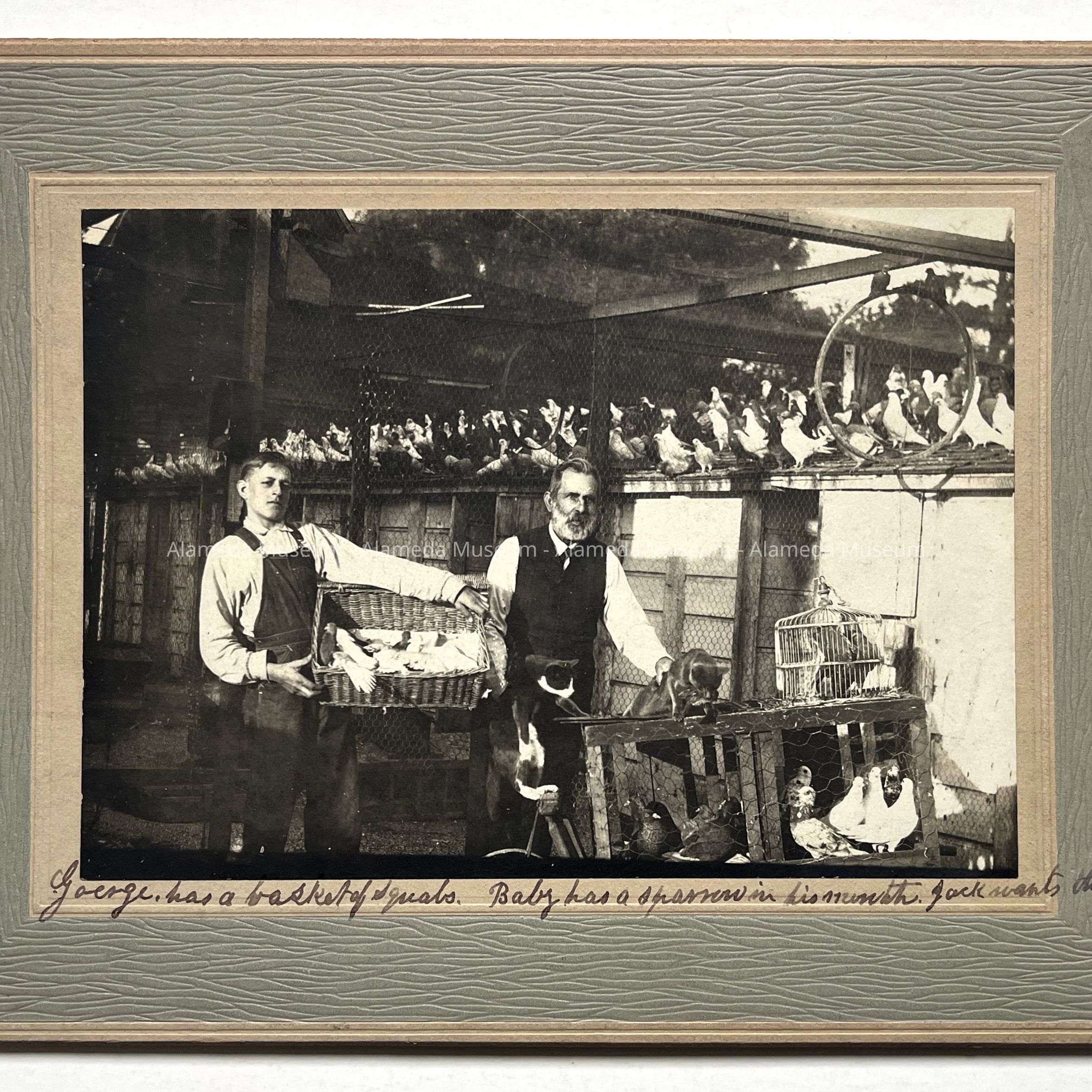 DESCRIPTION: PHOTOGRAPH, MOUNTED ON HEAVY GREY PHOTO MAT. THE MAT IS SIGNED DEJOINER, ALAMEDA, CAL. (AN ARTIST & PHOTOGRAPHER). SUBJECT: TWO MEN STANDING BEFORE LARGE BIRD PEN.