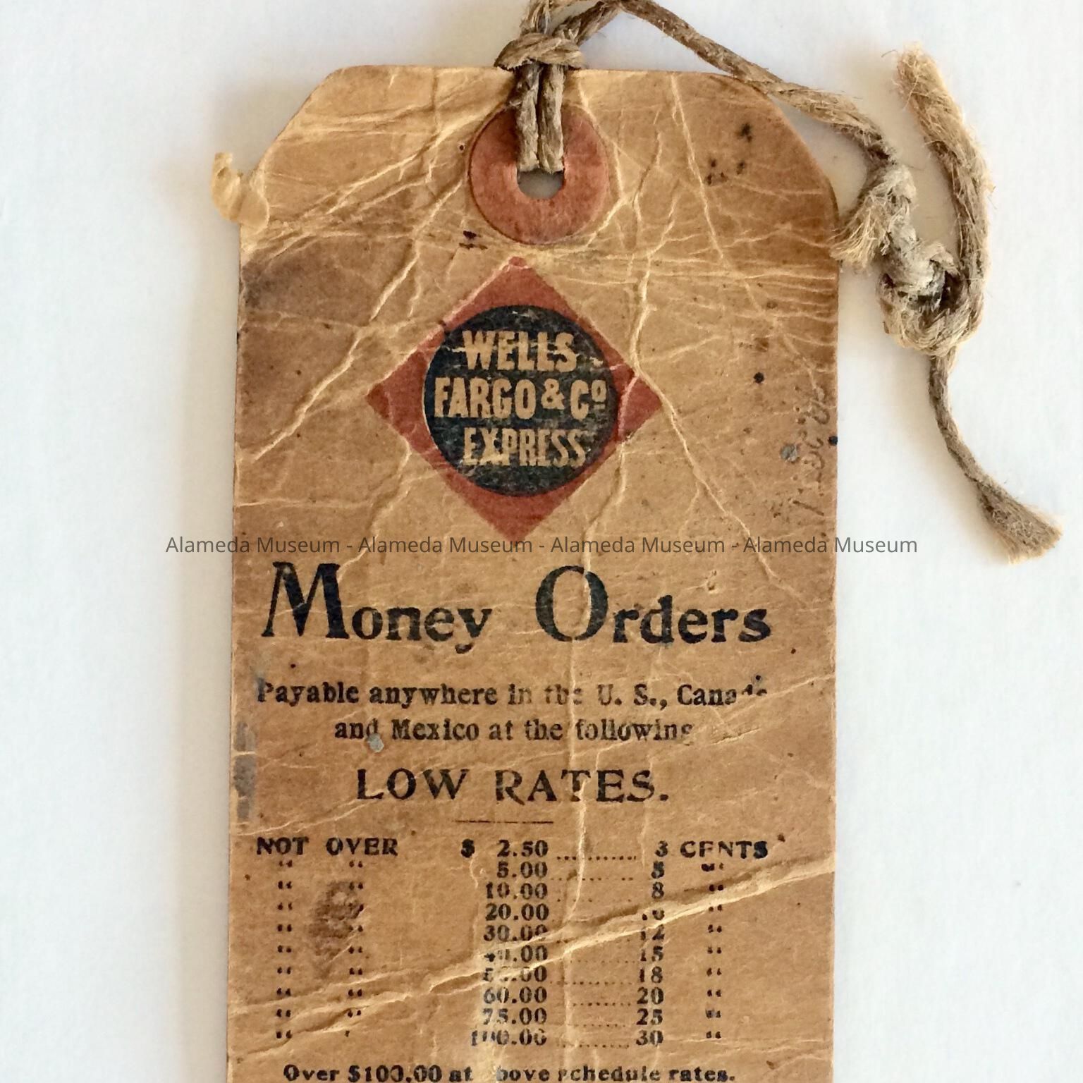 Description: Tag of heavy stock paper. The tag has been pierced and has a string for attaching. The face of the tag has the caption, "BPT, Wells Fargo and Company Express".