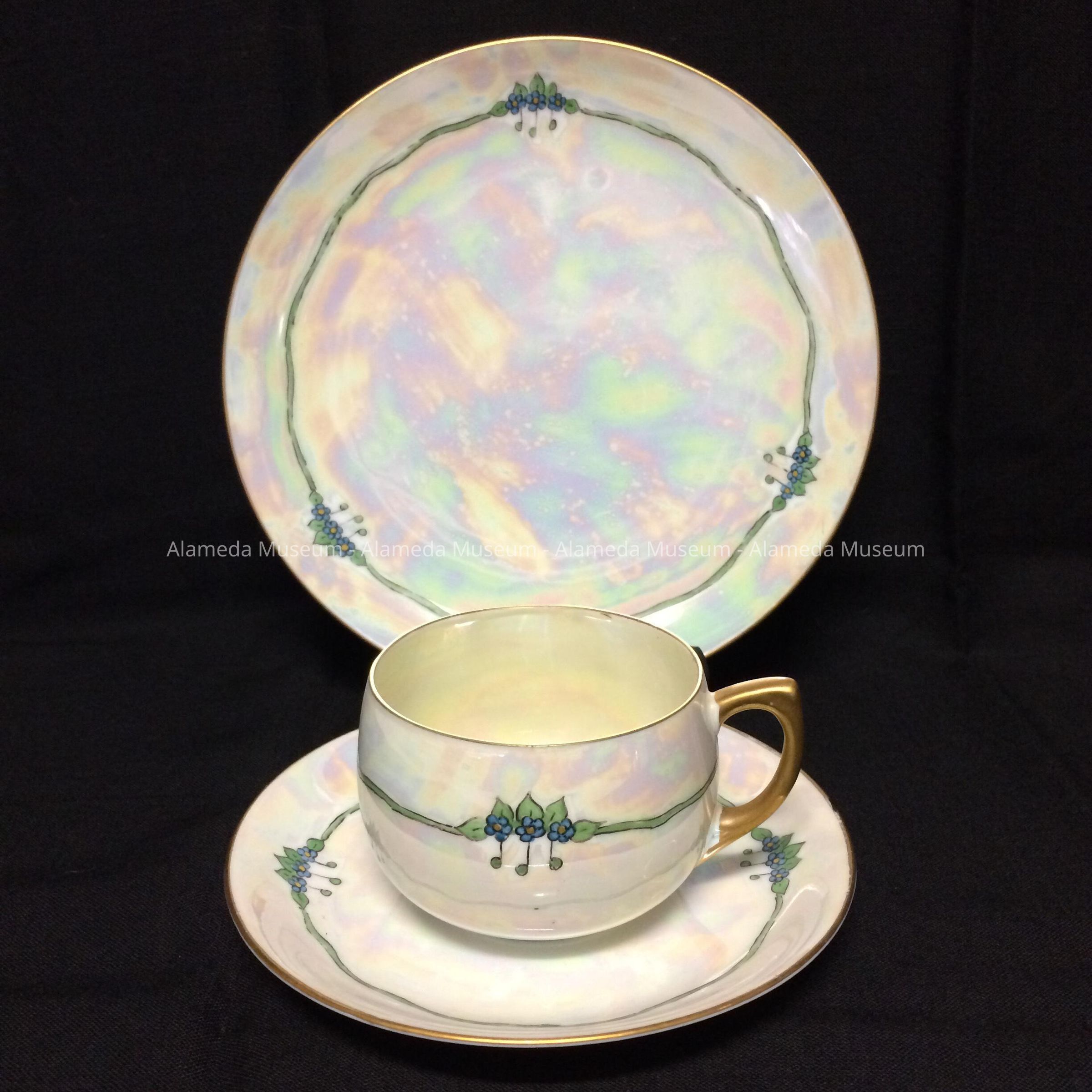 DESCRIPTION: HAND-PAINTED PORCELAIN LUNCHEON SET, CONSISTING OF CUP, SAUCER, AND PLATE, WITH A DESIGN IN HAND-PAINTED BLUE FLOWERS AND GREEN LEAVES ON A RAINBOW IRIDESCENT BACKGROUND. HANDLE AND RIM ARE ACCENTUATED IN GOLD. PORCELAIN IS SIGNED, "D & B, GERMANY."