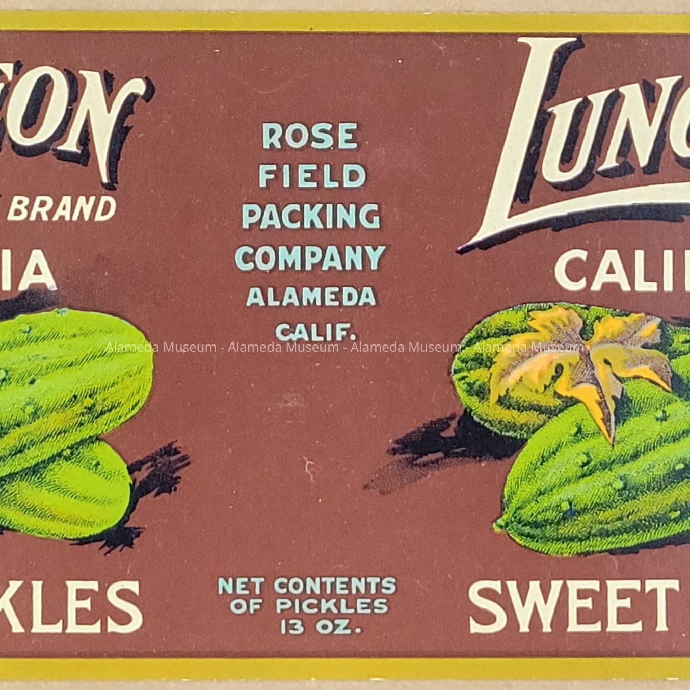 History of Object: This unused label was produced by the Rose Field Packing Co. of Alameda. They were the creators of Skippy Peanut Butter. White writing on a brown background with a drawing of two green pickles and a small golden leaf, shown twice and separated by “Rose Field Packing Company Alameda Calif.” and “Net Contents Of Pickles 13 oz.” written in blue on the middle of the label.