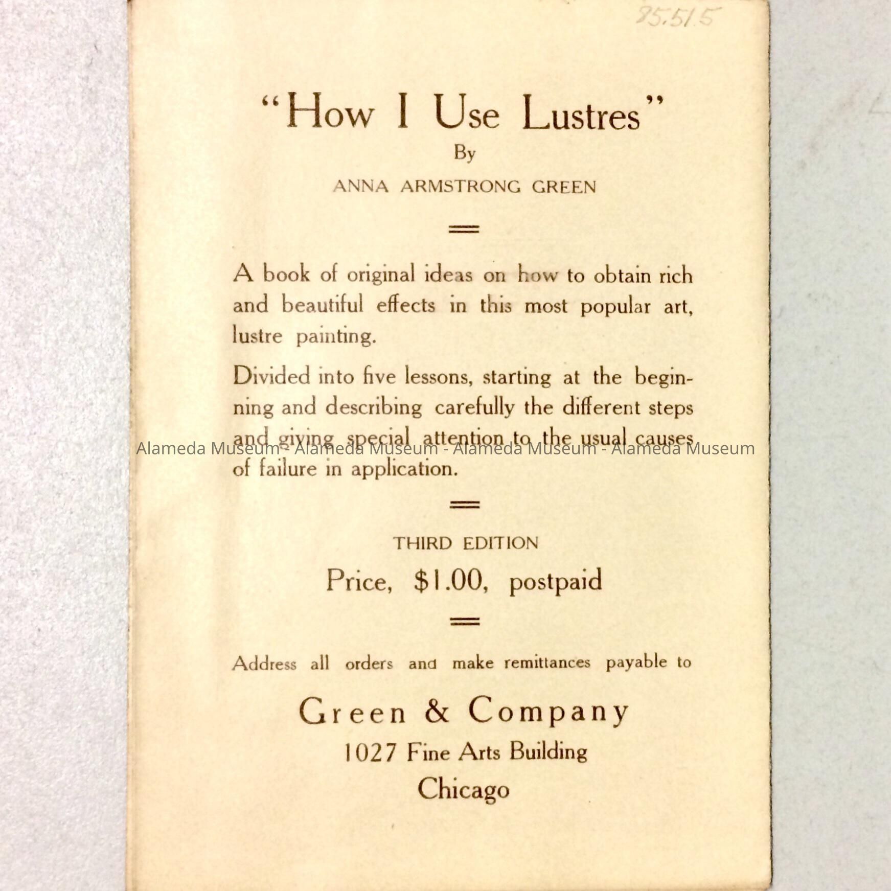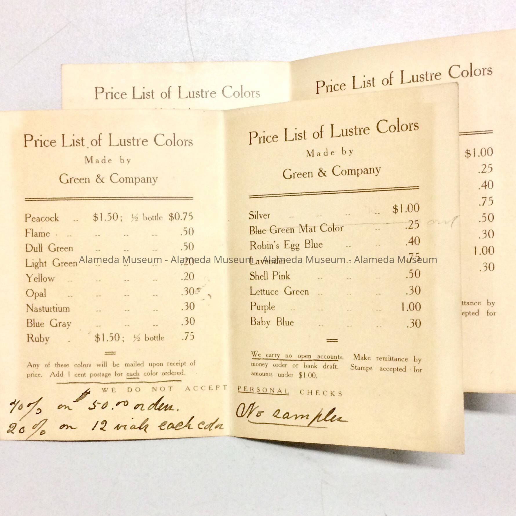 History of Object: Advertising list from Green & Company of Chicago, manufacturer of china lustres. The list was used for ordering by Elizabeth Thomas, china painter, Alameda.