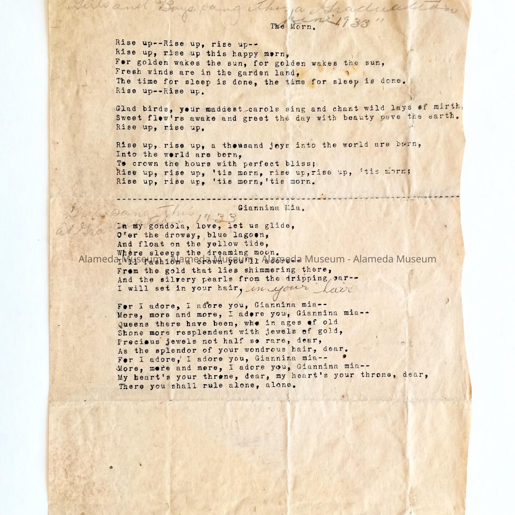 Lyrics for songs sung at the Lincoln School Graduation Ceremony, 1933Entry/Object ID