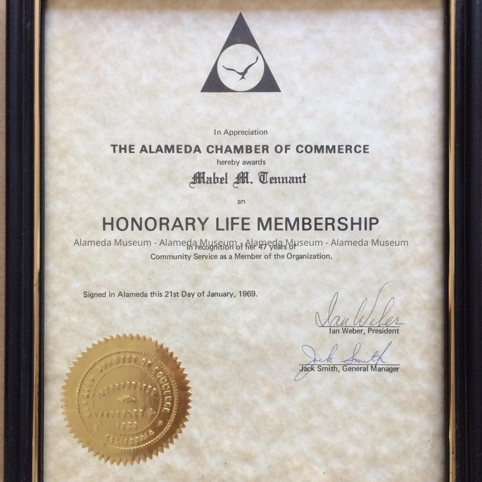 History of Object: Honorary life membership awarded to Mabel M. Tennan by the Alameda Chamber of Commerce, for 47 years of participation, dated Jan 21, 1969.