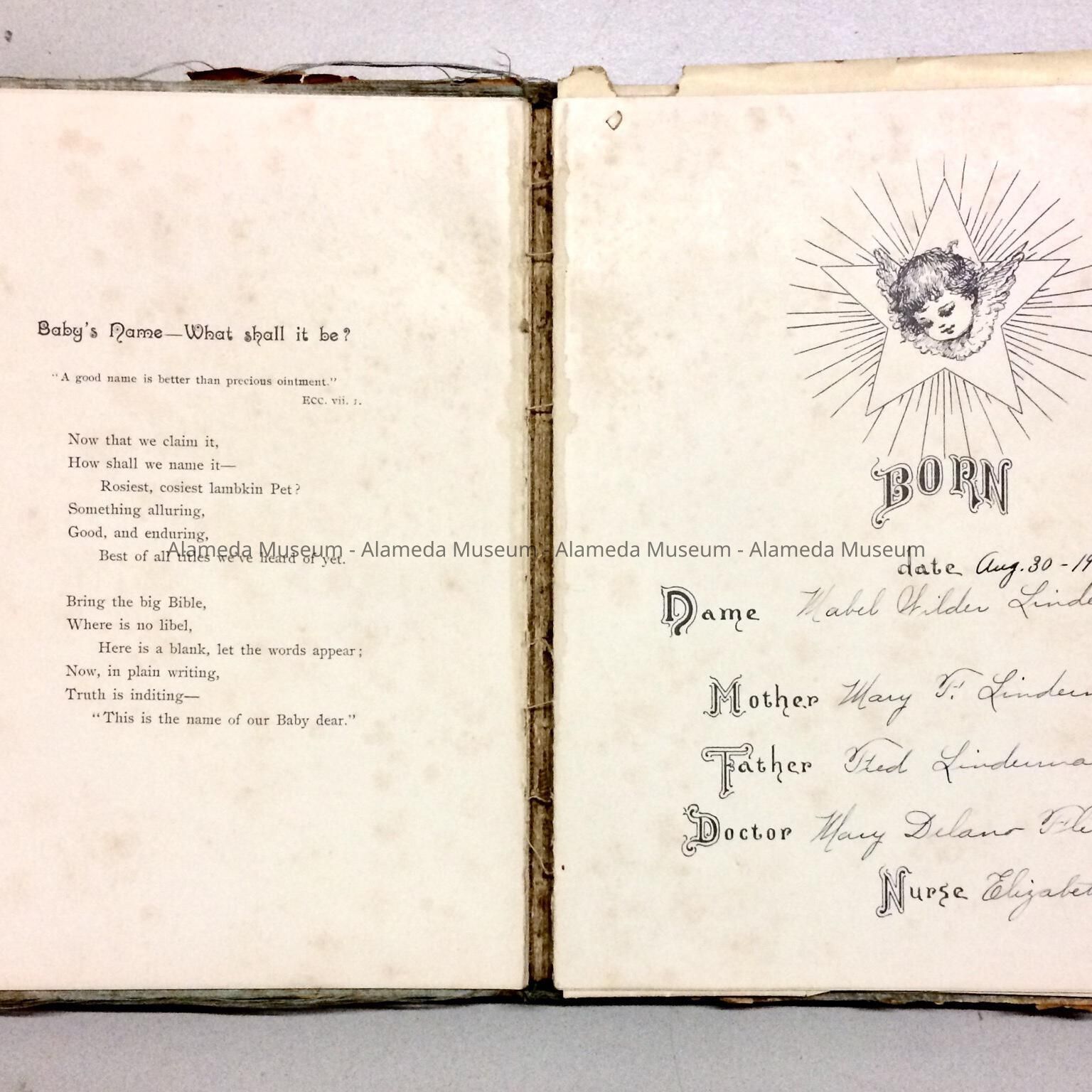 BABY BOOK OF MABEL WILDER LINDERMAN, BORN ON AUGUST 30, 1902. SHE WAS THE DAUGHTER OF MARY FRANCES AND FRED LINDERMAN. MARY DELANO FLETCHER, PHYSICIAN. DR FLETCHER WAS AN EARLY FEMALE PHYSICIAN AND RESIDENT OF ALAMEDA.
