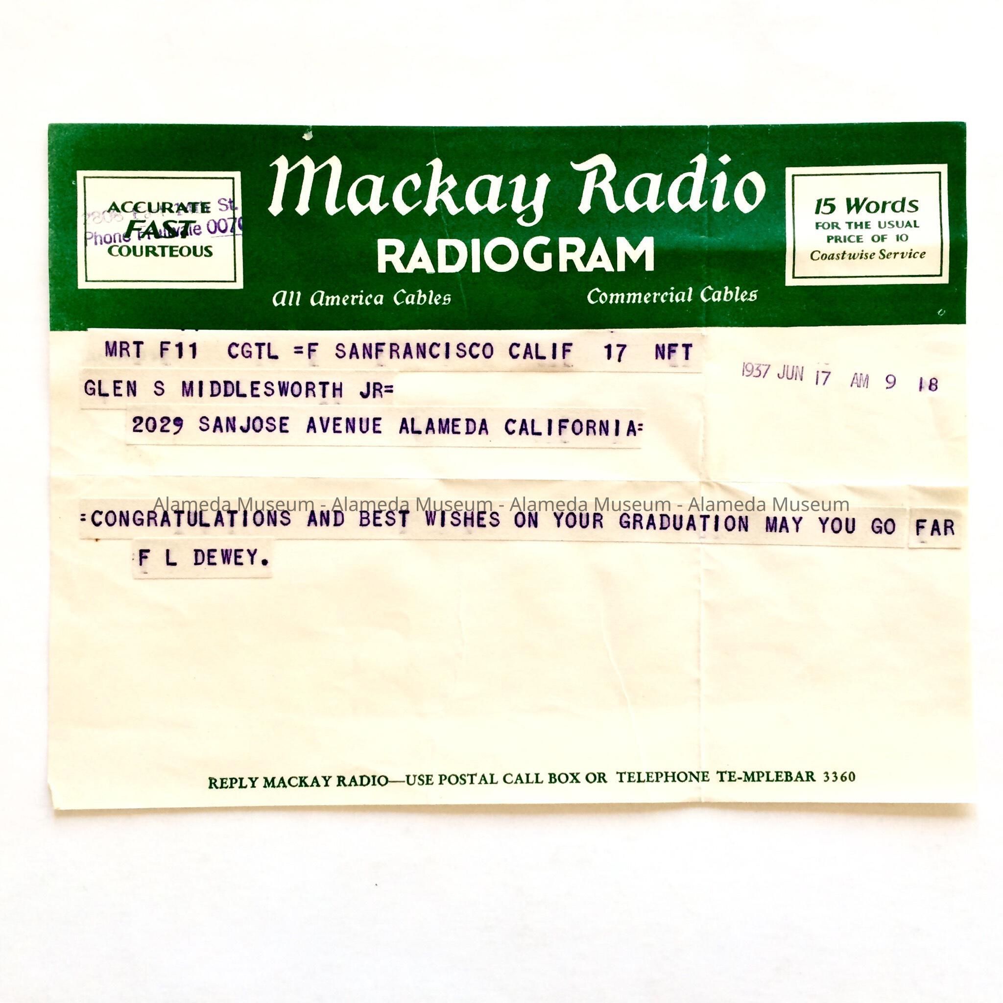 History of Object: Radiogram addressed to Glenn S. Middlesworth Jr., 2029 San Jose Avenue, Alameda, Ca., congratulating him upon his graduation from the Alameda High School, June 17, 1937.