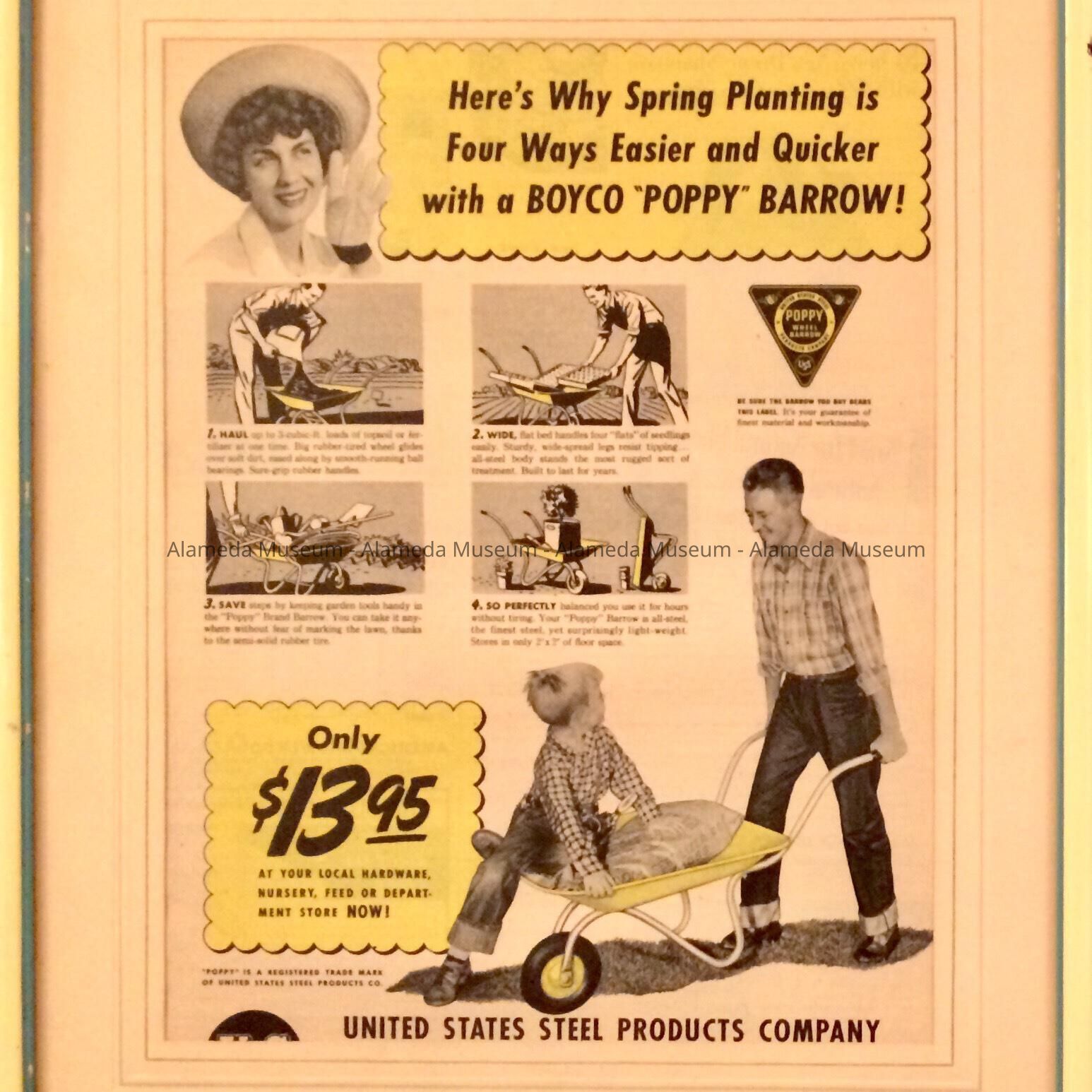 A MAGAZINE PAGE ADVERTISING. BOYCO, A DIVISION OF US STEEL PRODUCTS CO. THE BUSINESS WAS LOCATED AT 1849 OAK ST, ALAMEDA. THIS. PARTICULAR ADVERTISEMENT PERTAINS TO WHEELBARROWS.