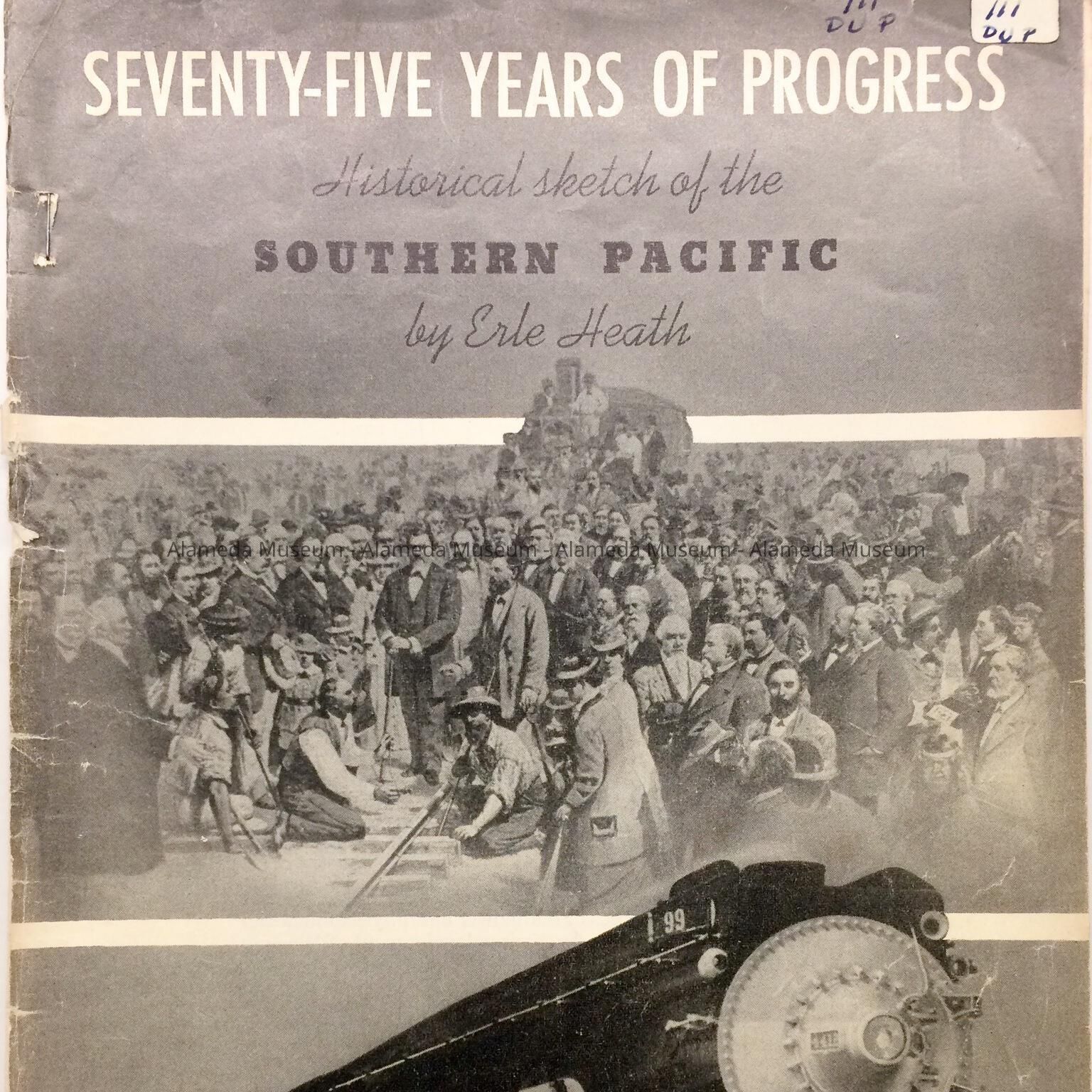 Magazine entitled “Seventy-Five Years of Progress, Historical Sketch of the Southern Pacific.” The publication was printed by the Southern Pacific honoring 75 years of progress. Page 11 has a chapter on railroad history in Alameda mentioning the San Francisco and Alameda Railroads and the passenger wharf on the West end.