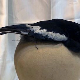 Description: partial magpie with head, partial back and wings sewn onto a irregularly shaped cotton patch. Includes pearl-button pin.