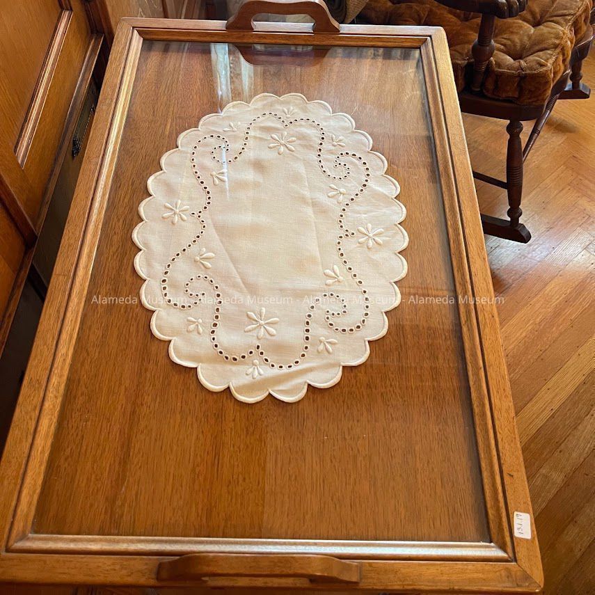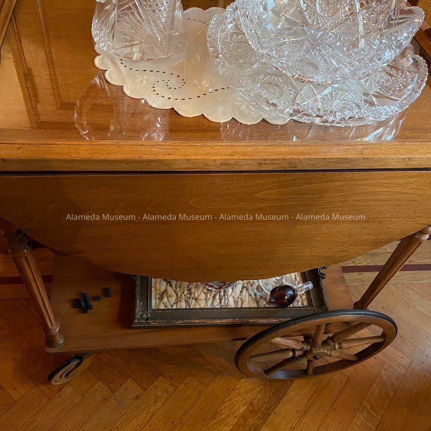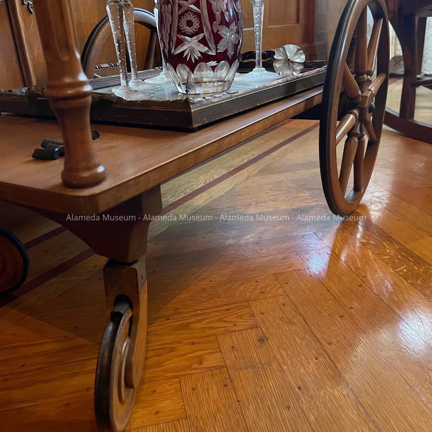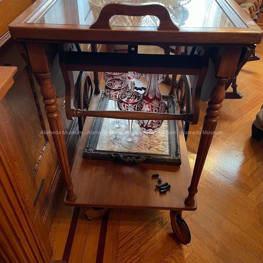 History of Object: A tea cart made in Grand Rapids, MI, constructed of mahogany that has been bleached and treated to harmonize with the woodwork in the dining room of the Meyers House.