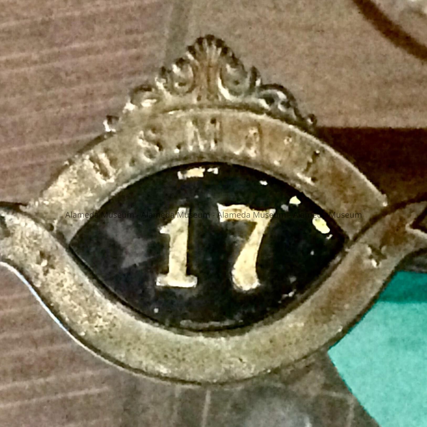 History of Object: Emblem "17" (route number) which was attached to the cap worn by Alameda mail carrier Hal Chrisman.