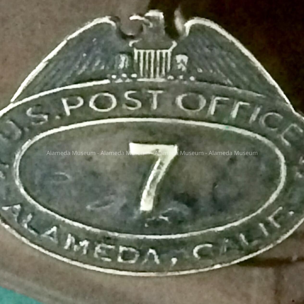 History of Object: Emblem which was attached to the cap, part of the mail carrier’s uniform, Alameda Post Office. This particular emblem belonged to Hal Chrisman, father of the donor. Mr. Chrisman, born Texas 1879, arrived in California in the early 1900's, and came to Alameda from San Francisco following the earthquake & fire of 1906. The family originally lived at 424 Santa Clara Avenue, where the donor was born (1908). Mr. Chrisman retired from the Alameda Post Office in 1922.