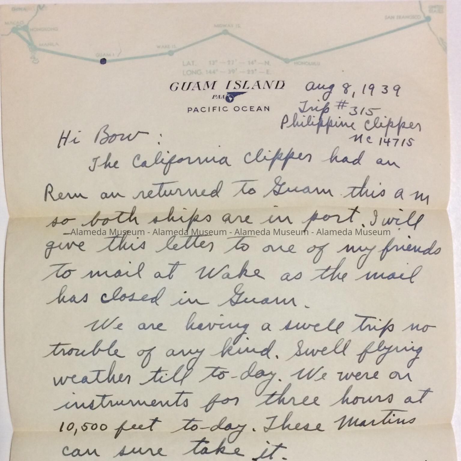 Mail sent from Wake Island to Alameda by China Clipper, on Pan American Airways stationery, 1939Entry/Object ID