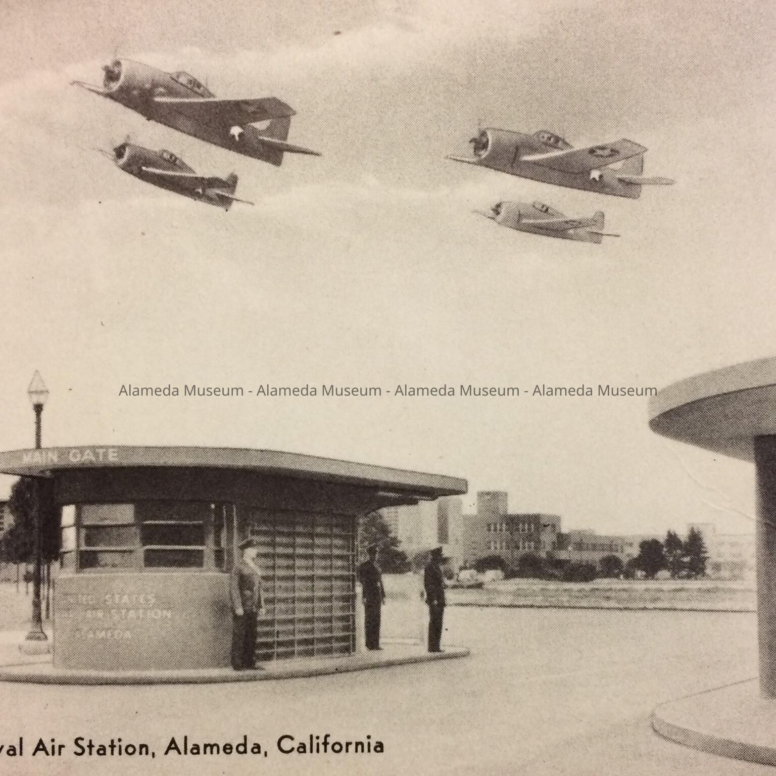 Main Entrance US Naval Air Station, Alameda, with 4 Jets, c. 1950sEntry/Object ID