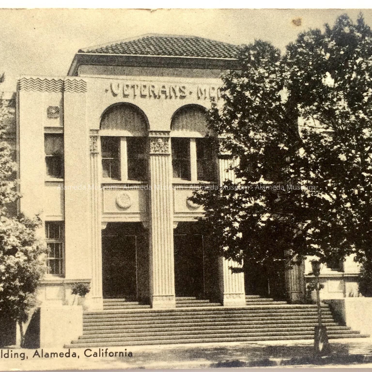 A POST CARD DEPICTING THE MAIN FACADE OF THE VETERANS' MEMORIAL BUILDING, ALAMEDA [ERECTED 1929]; HENRY H MEYERS, ARCHITECT.