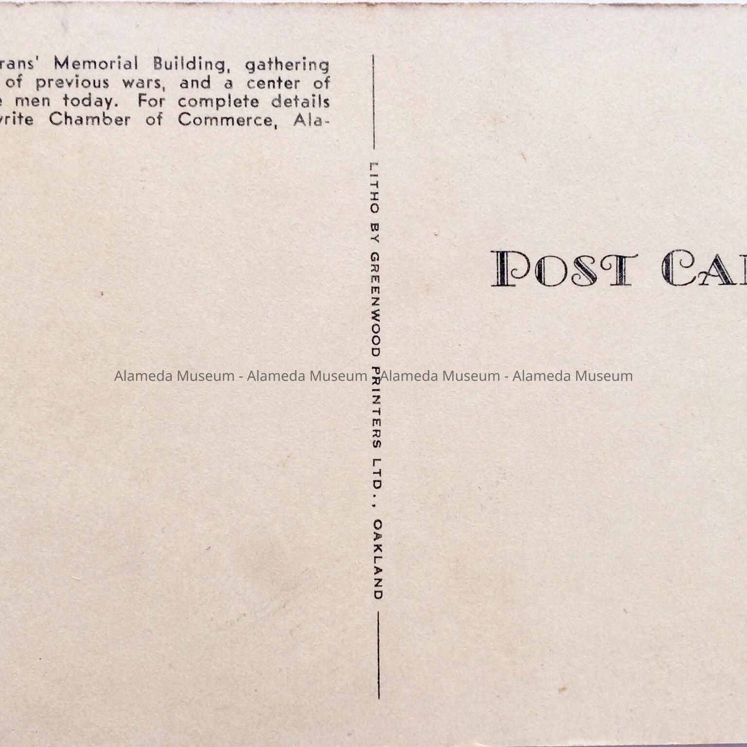 A BLACK-AND-WHITE PHOTOGRAPHIC POST CARD, UNCIRCULATED, PRINTED BY GREENWOOD PRINTERS, OAKLAND.