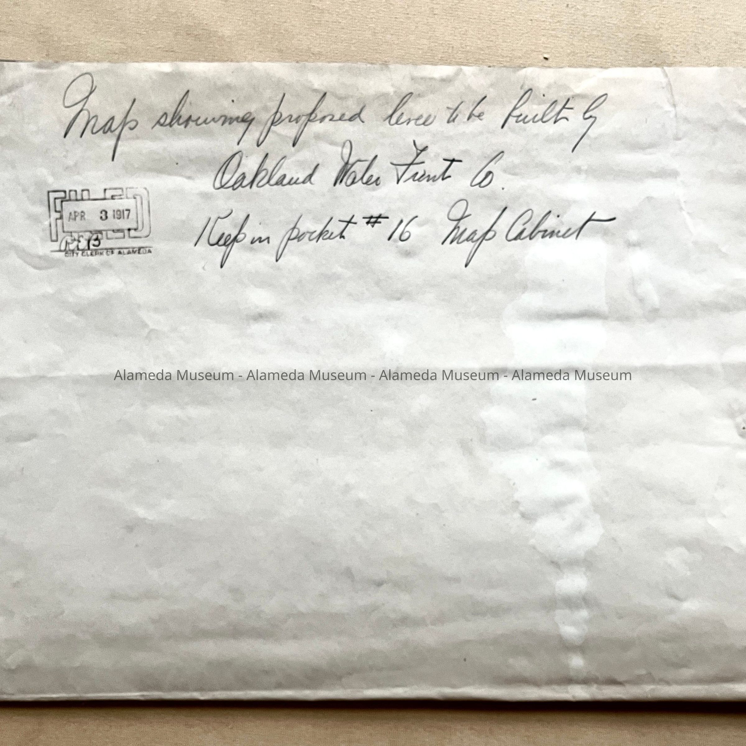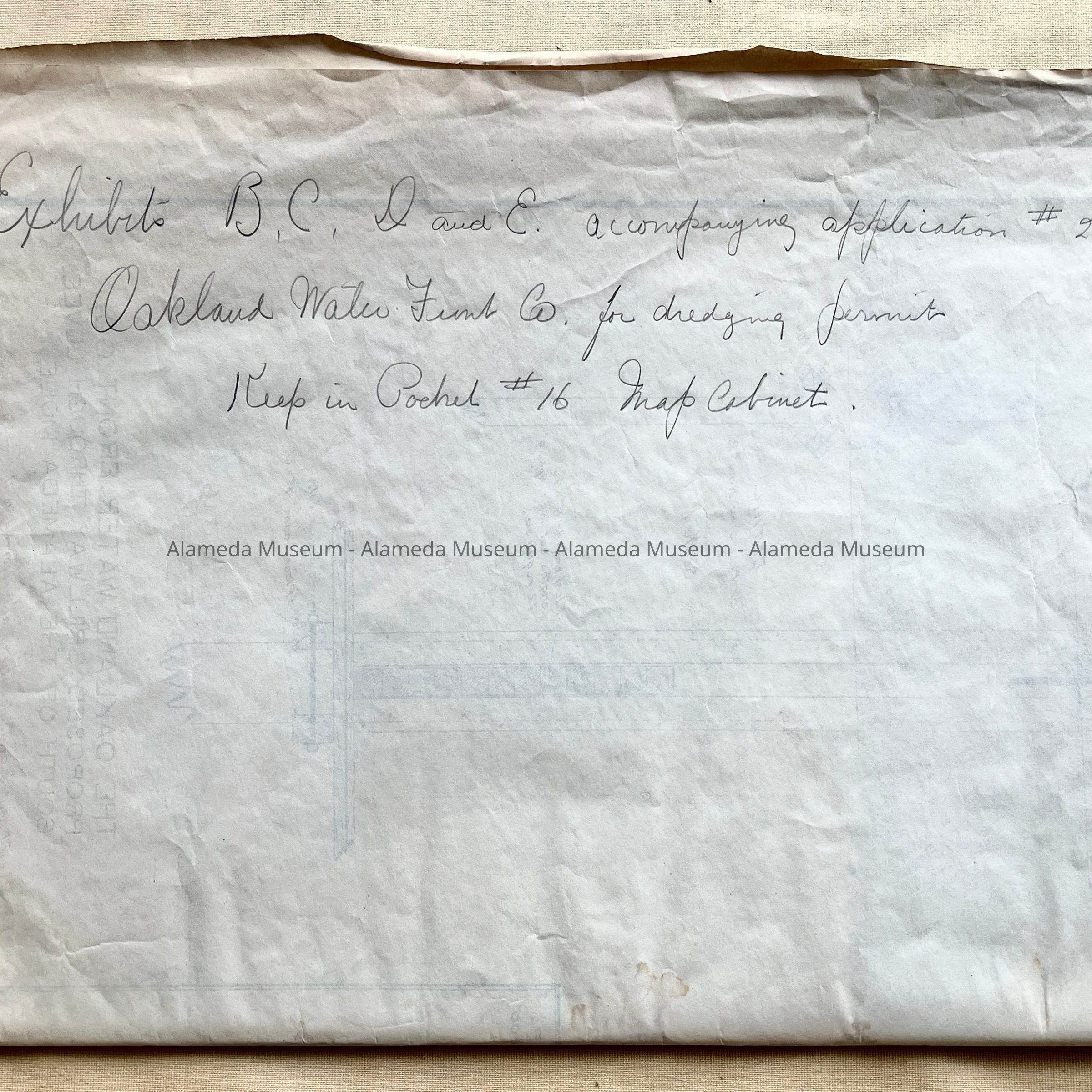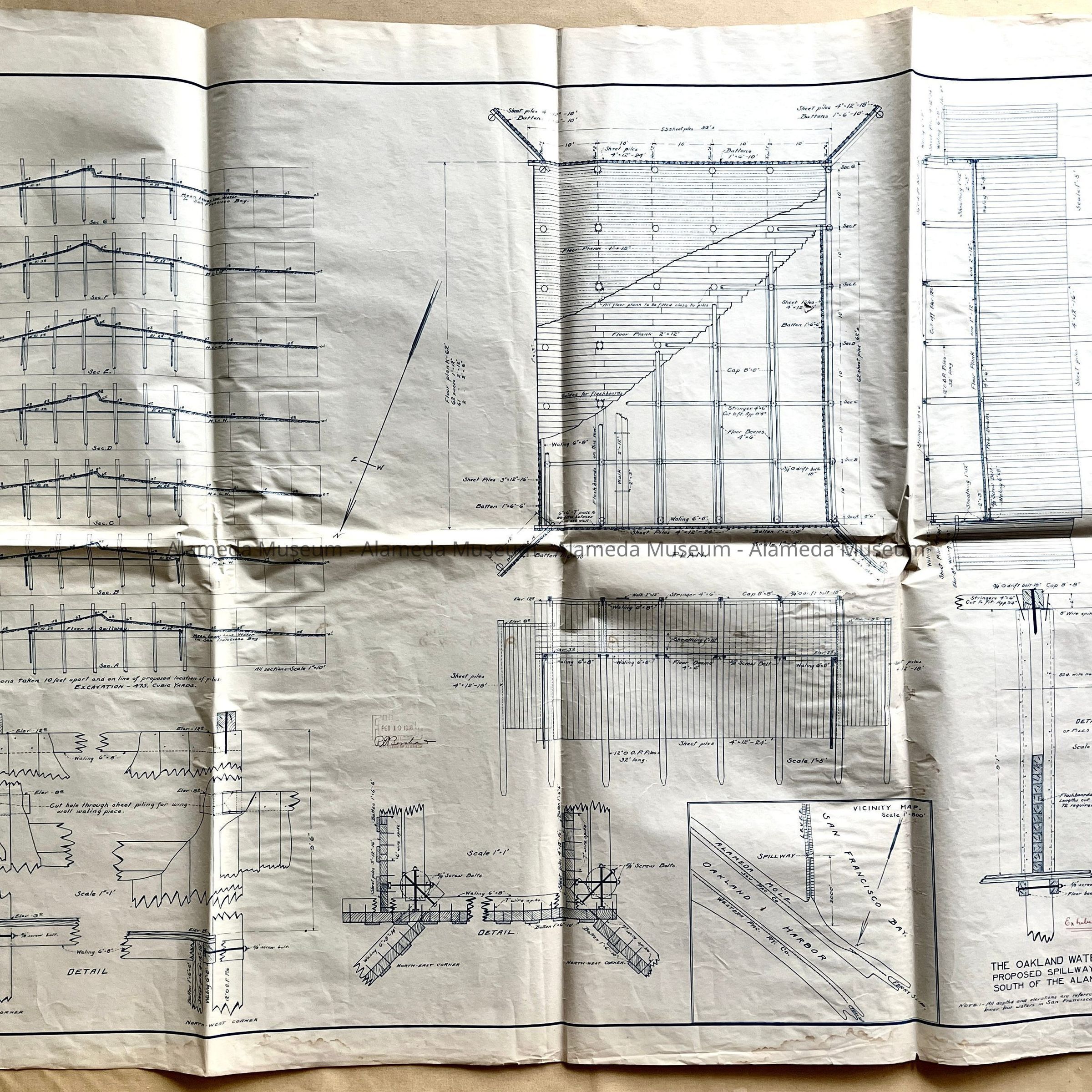 HISTORY OF OBJECT: MAP DEPICTING A PROPOSED LEVEE FOR THE OAKLAND WATER FRONT COMPANY, IN THE MARSHES IN THE WEST END OF ALAMEDA, LATER SITE OF THE ALAMEDA NAVAL AIR STATION, CONNECTING TO THE RAISED DIKE OF THE ALAMEDA MOLE. THE DRAWINGS DESCRIBE A SPILLWAY IN THE PROPOSED LEVEE.