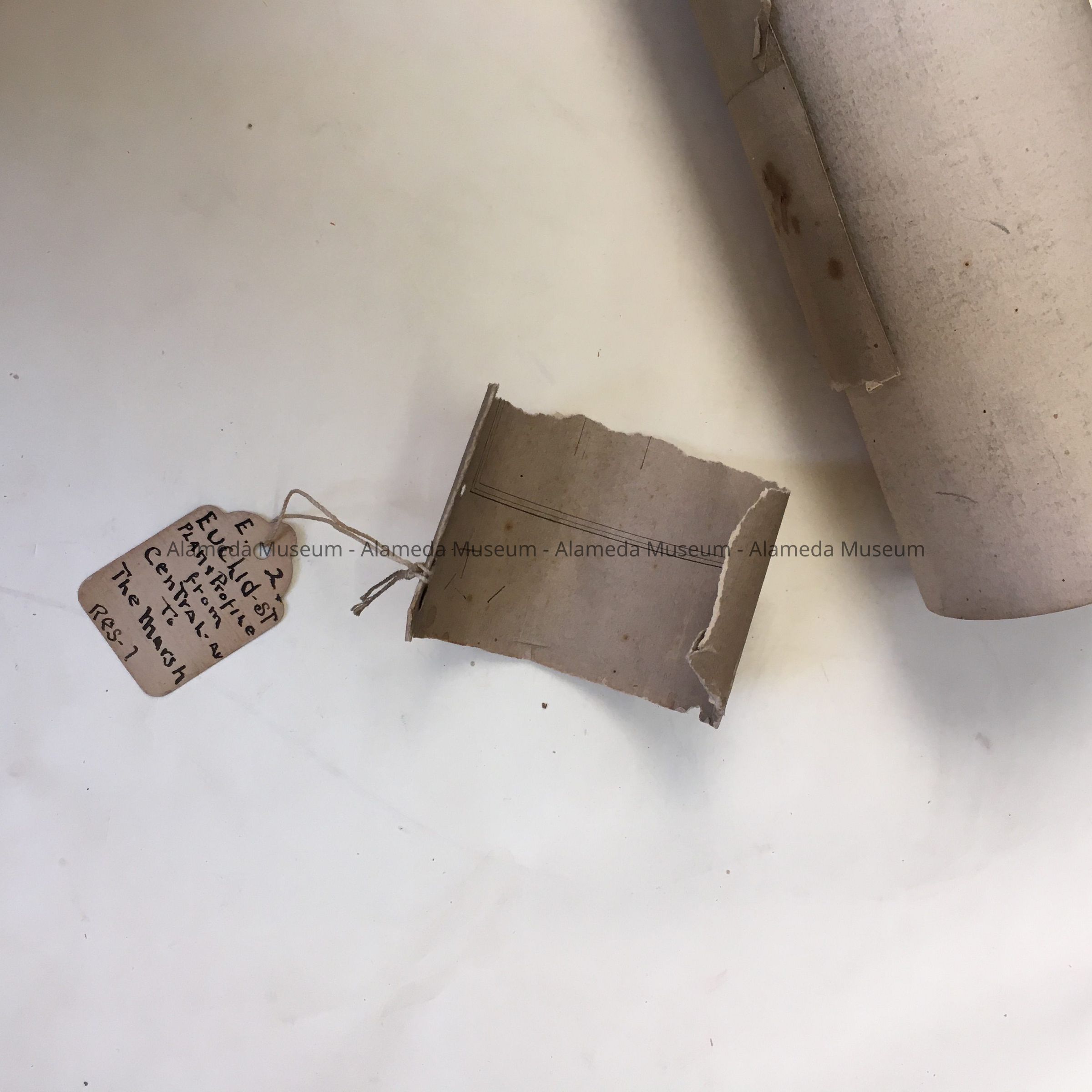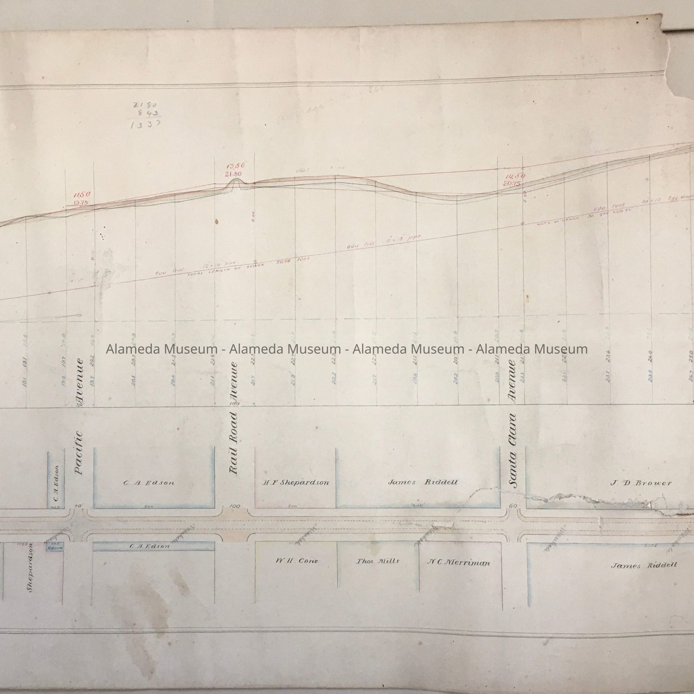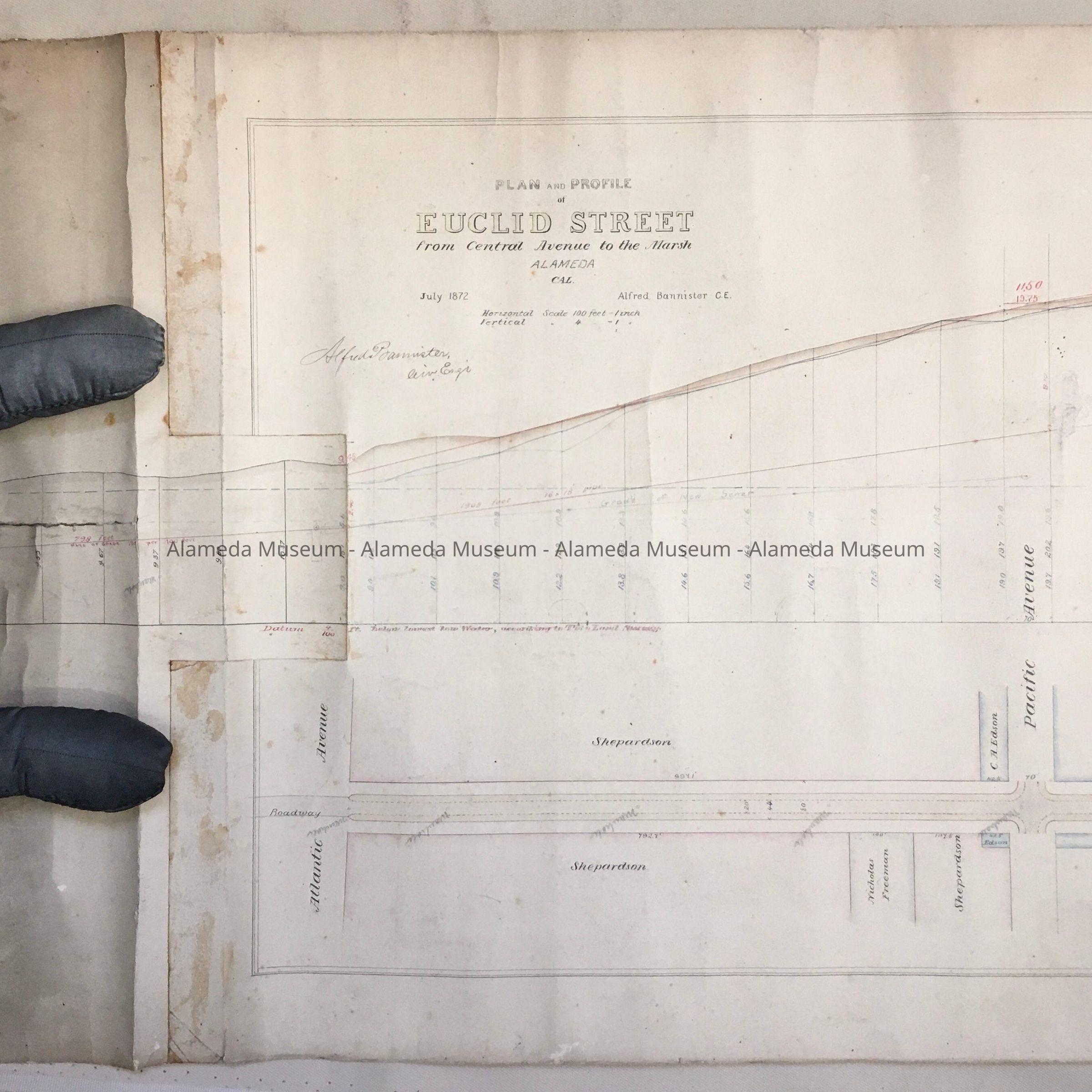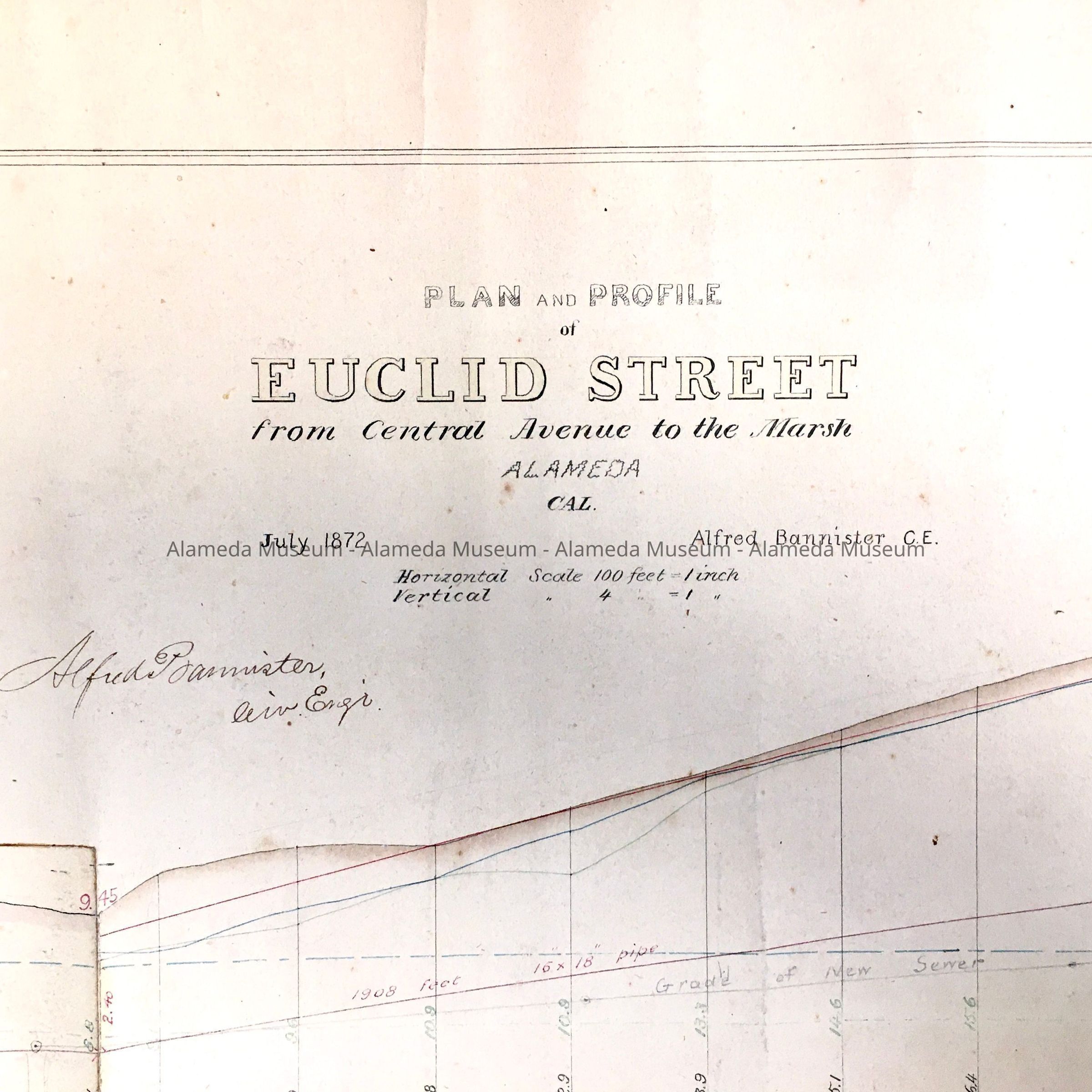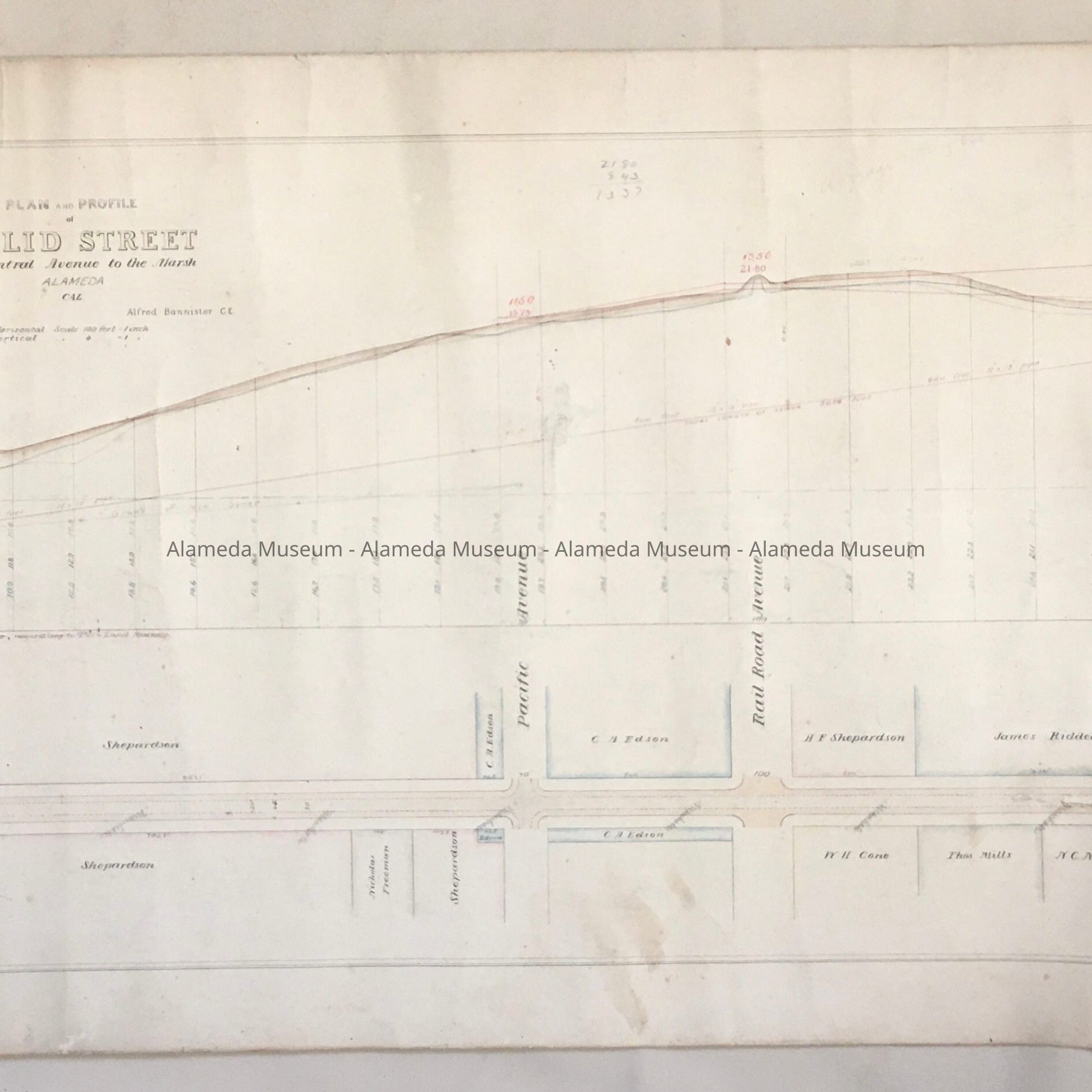 HISTORY OF OBJECT: PLAN AND PROFILE OF ENCINAL AVENUE FROM CENTRAL AVENUE TO THE MARSH, NOW KNOWN AS WEBSTER STREET. MAP WAS DRAWN BY ALFRED BANNISTER, CIVIL ENGINEER. MAP INCLUDES PROPERTY OWNERS' NAMES, BORDERING WEBSTER ST.