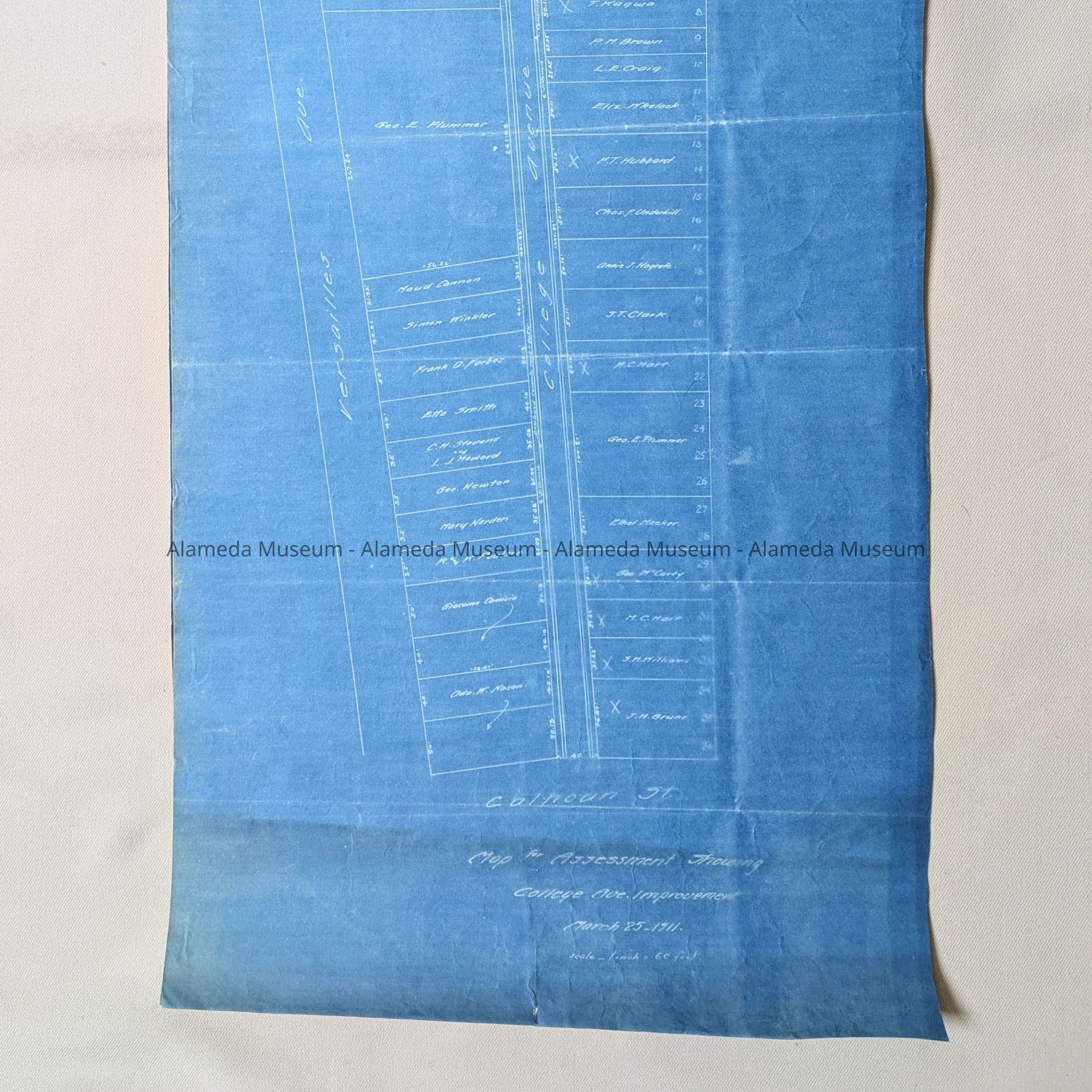 History of Object: Map for Assessment Showing College Ave. Improvement, 1911. Found in the attic of City Hall in the 1990s.