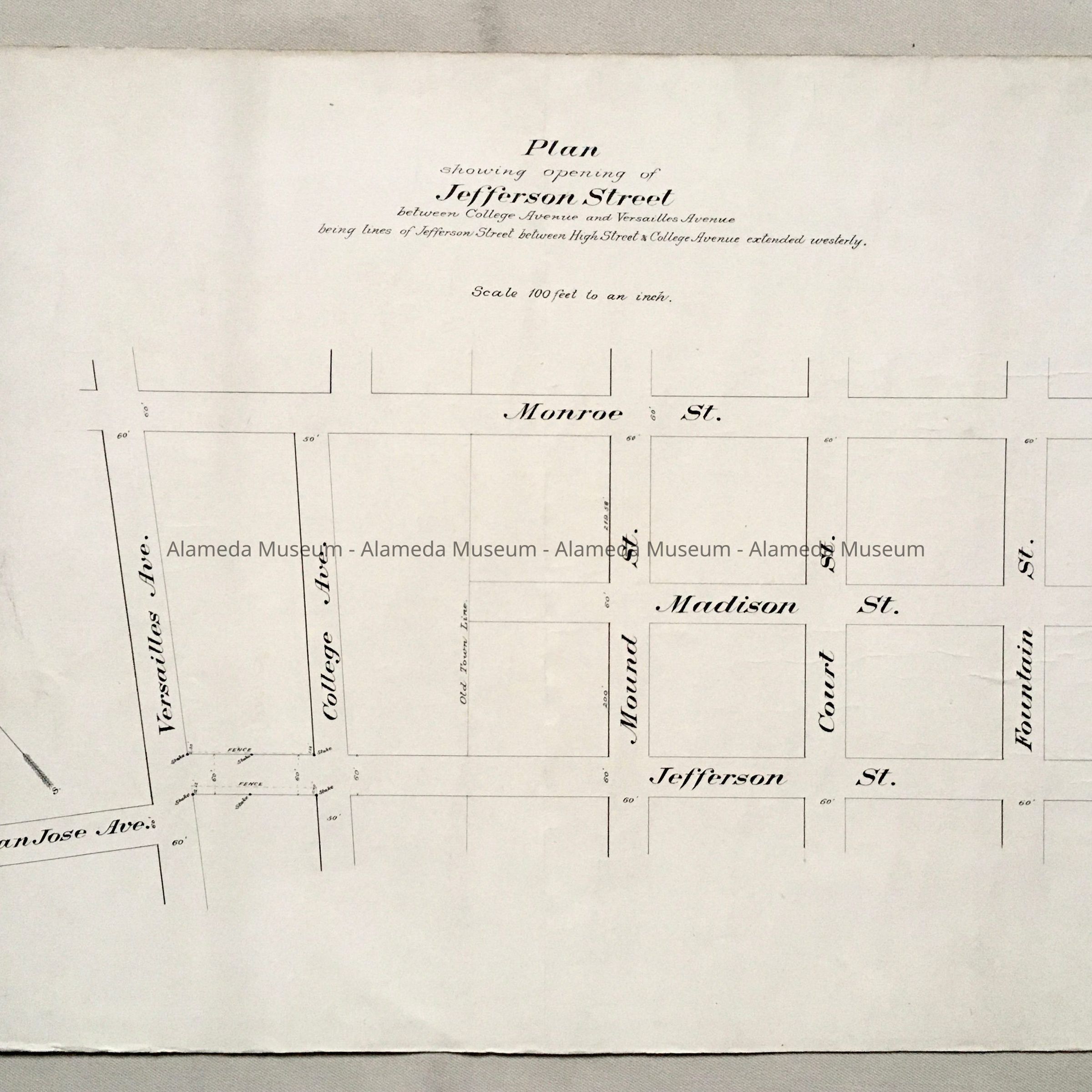 Drawing giving a plan for the opening of “Jefferson Street” now known as San Jose Avenue between College and Versailles.
