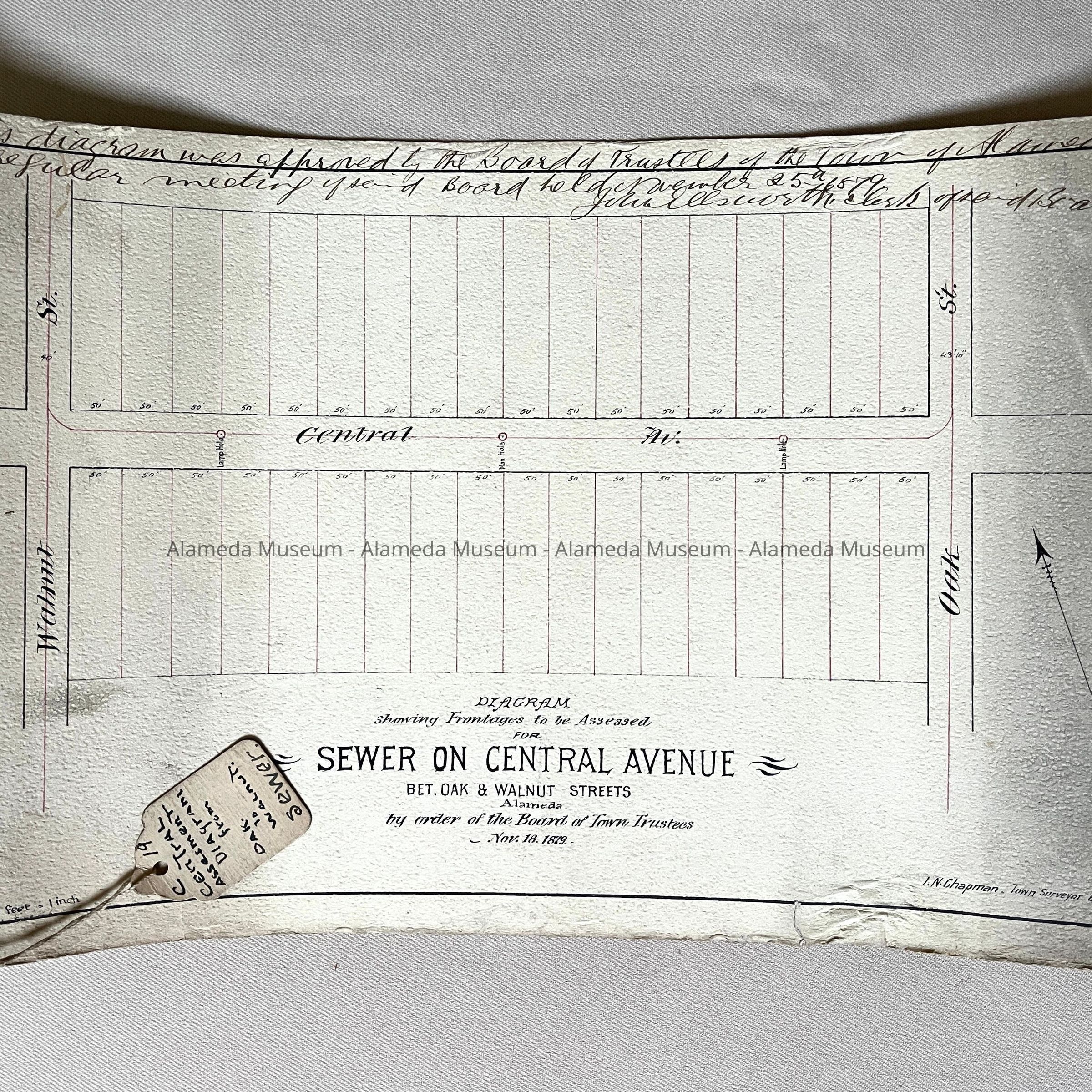 Description: A Map, hand-drawn on off-white card stock paper, with blocks and marked in black ink with red lines marking the property lines and the sewer. Title: 'Diagram Showing Frontages to be Assessed for Sewer on Central Avenue / Bet. Oak & Walnut Streets / Alameda / by order of the Board of Town Trustees / Nov. 18, 1879. Signed I.N. Chapman, Town Surveyor & C.E. At top is hand-written in black ink: 'This diagram was approved by the Board of Trustees of the Town of Alameda at a regular meeting of said Board held November 25, 1879. John Ellsworth, clerk of said Board.' Has original filing tag from city hall attached.