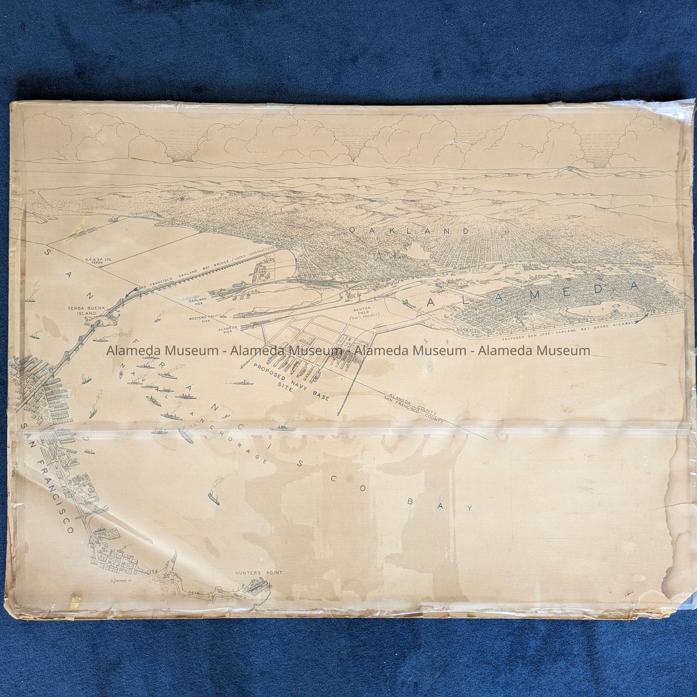 HISTORY OF OBJECT: A MAP DEPICTING A PROPOSED NAVAL AIR STATION SITE AT THE WEST END OF ALAMEDA. ALSO INCLUDED IS A PROPOSED SAN JOSE/OAKLAND/BAYSHORE HIGHWAY AT THE APPROXIMATE SITE OF OTIS DRIVE. THE MAP IS ALSO ILLUSTRATED WITH THE SAN FRANCISCO/OAKLAND BAY BRIDGE UNDER CONSTRUCTION AT THE OAKLAND PIER, ETC.