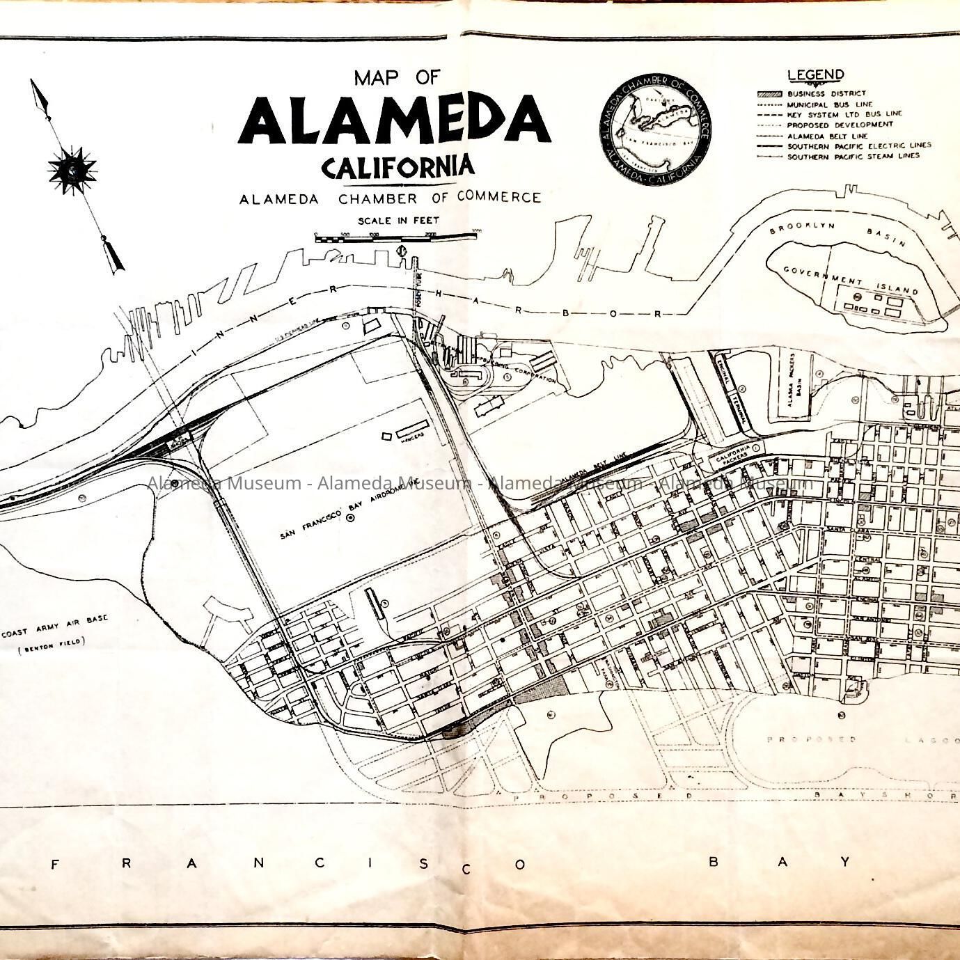 Description: Map of Alameda, printed one-sided, and folded in four, featuring a proposed lagoon, proposed Bay Shore Highway, Alameda Mole, Alameda Airport, Inc., West Coast Army Air Base (Benton Field), and San Francisco Bay Airdrome, Belt Line yard, and California Packers building. On the bottom right is written: 'Mark Pryor' in pencil.