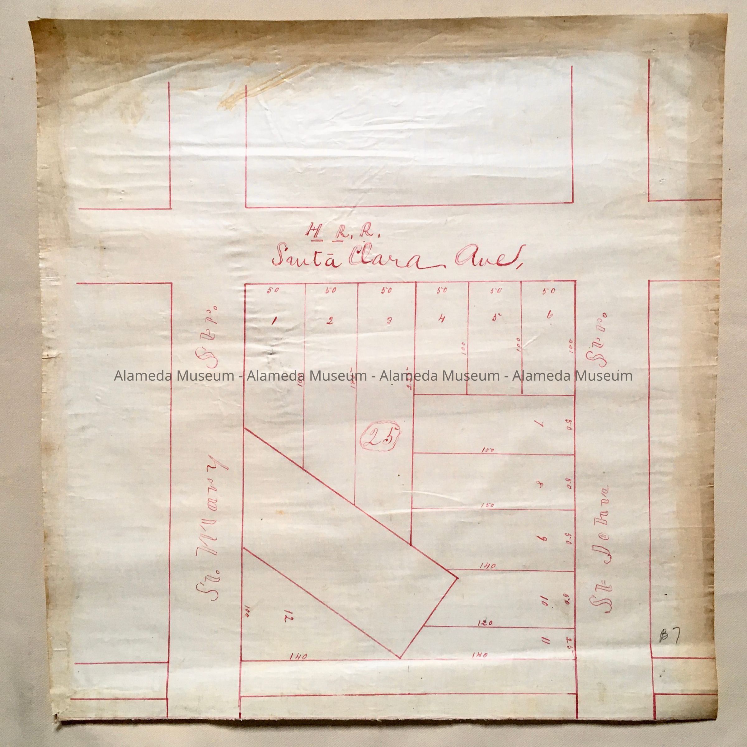 Early map depicting block bounded by St. Mary and St. John Streets and Santa Clara Avenue, being Block 25 This collection of maps, etc., found in the attic of City Hall prior to the rehabilitation and seismic upgrades in the late 1990's.