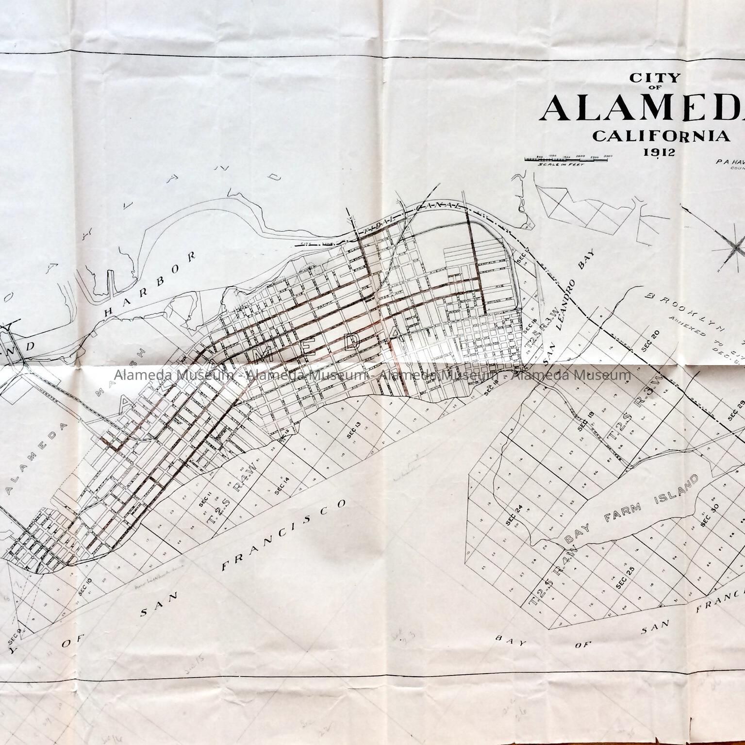 Description: Paper map of Alameda, caption "City of Alameda 1912", including Bay Farm Island. Map shows subdivisions and future location for Waterside Terrace, but not yet named. See area on map above Garfield Avenue. Lots in the Bay have been partially added in pencil. Some streets have been colored in reddish-brown pencil, for use in documents of item 2180. County Road No. 1468 is indicated on Bay Farm Island. Map is signed P.A. Haviland, County Surveyor. Map has stamped number 85-2 on the lower right, and 2180-3 handwritten in black ink on the back.