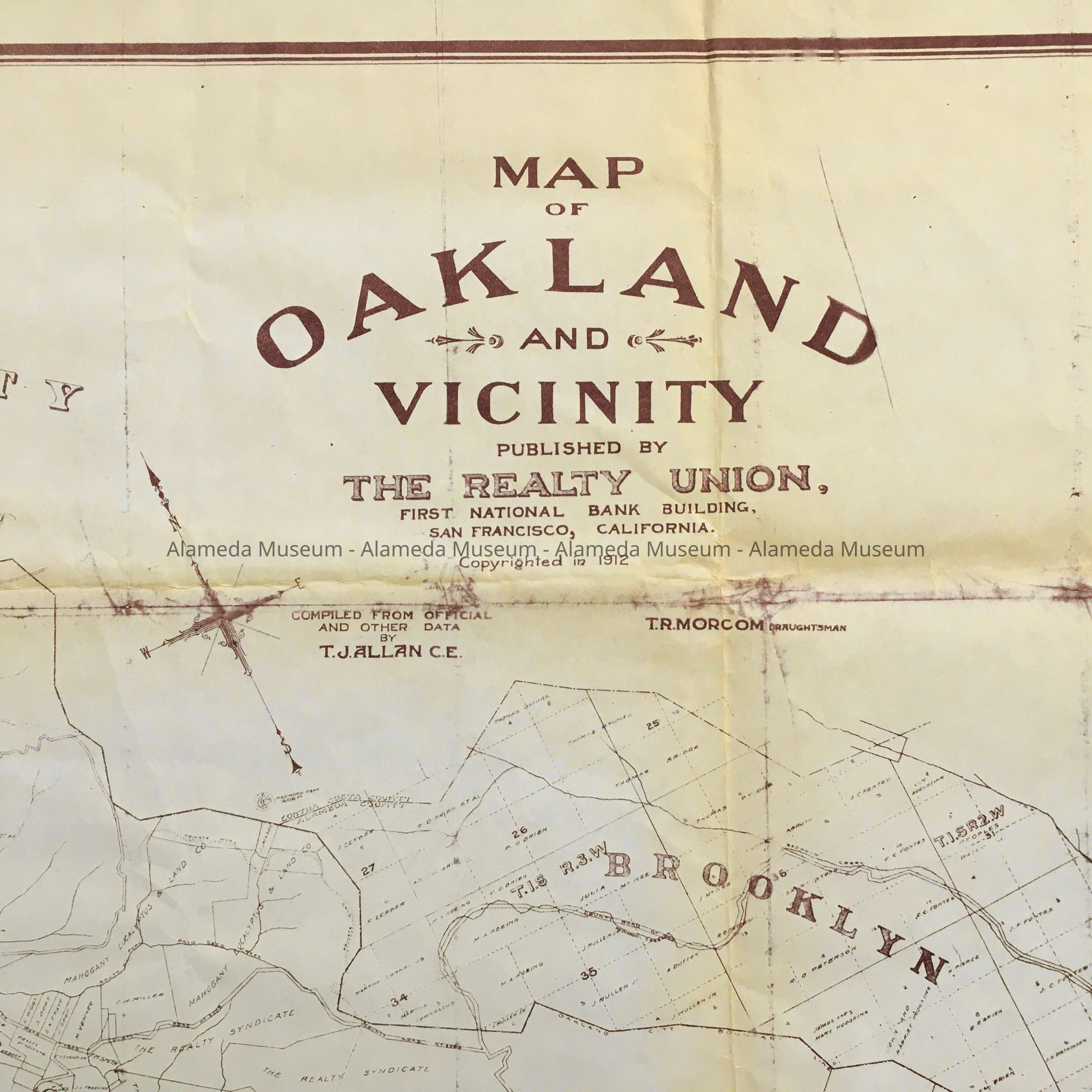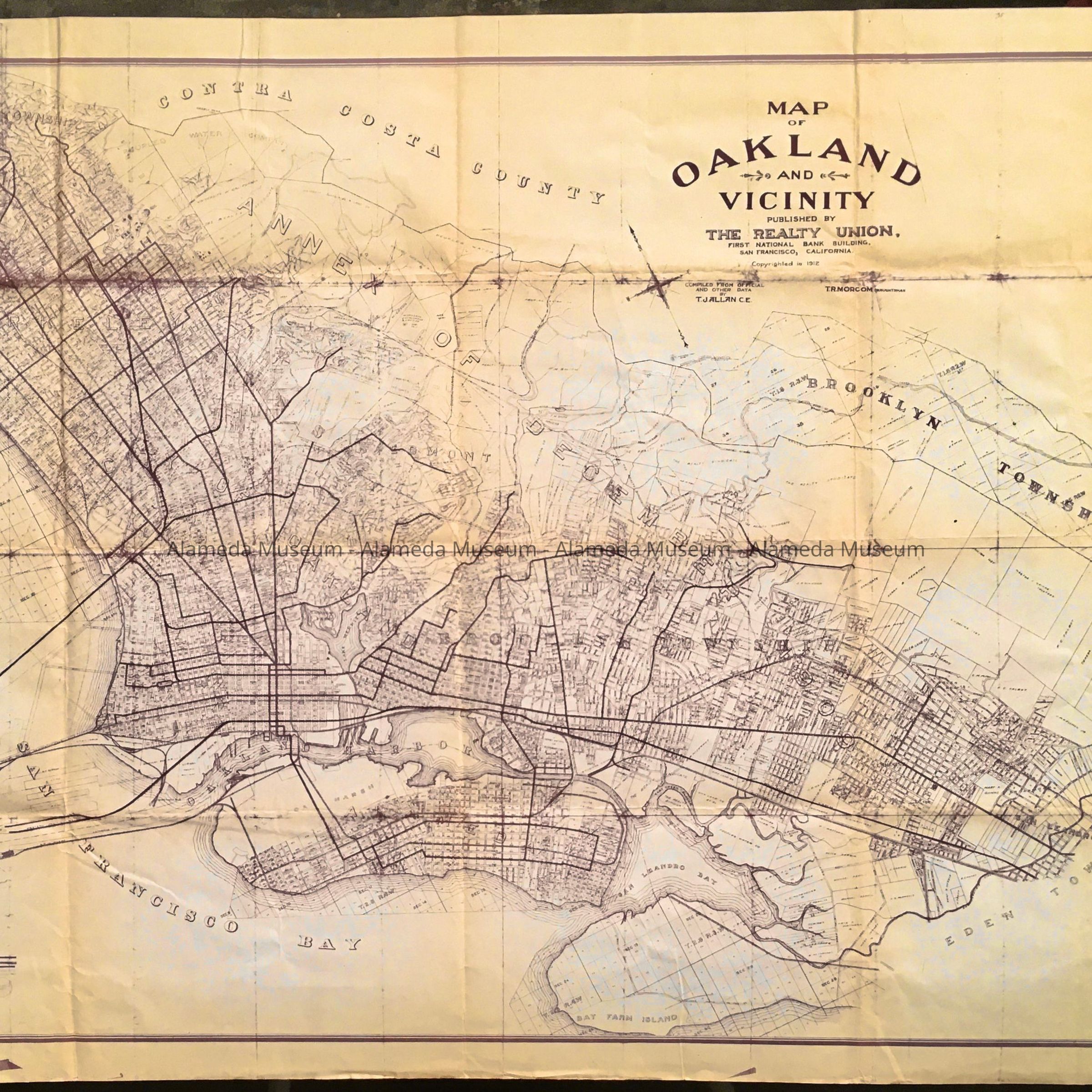 HISTORY OF OBJECT: A MAP DEPICTING ALAMEDA, OAKLAND, AND BAY FARM ISLAND, PUBLISHED IN 1912 BY THE REALTY UNION. THE MAP WAS GIVEN TO THE HISTORICAL SOCIETY IN 1959 AND NOT CATALOGED UNTIL 2015.