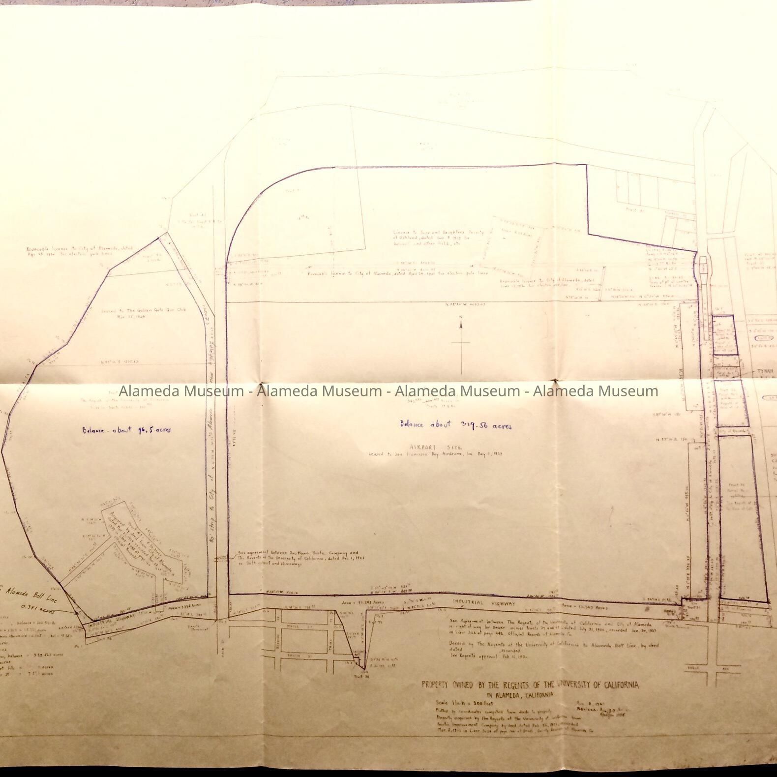 HISTORY OF OBJECT: A MAP ORIGINALLY CREATED IN 1923 WITH ADDENDA DATED 1940. MAP DEPICTS THE AIRPORT SITE OF THE SAN FRANCISCO BAY AIRDROME, PRESENT LOCATION OF THE COLLEGE OF ALAMEDA.