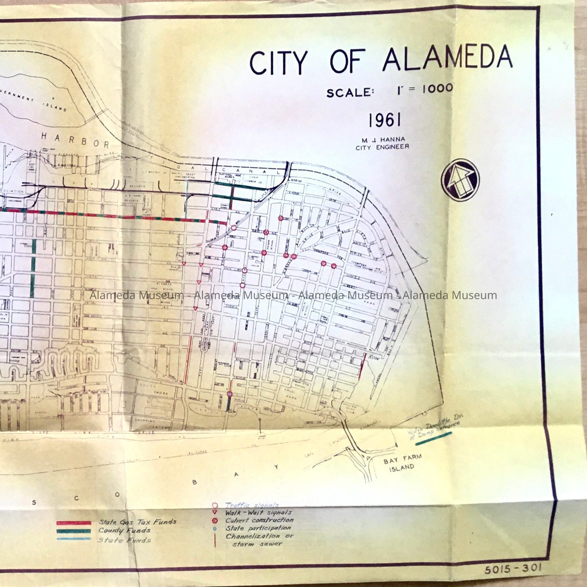 History of Object: Map of Alameda with lagoon areas marked in, showing locations for road improvements funded with state or county funds; storm sewer or channels; and culvert constructions, walk-wait and traffic signal